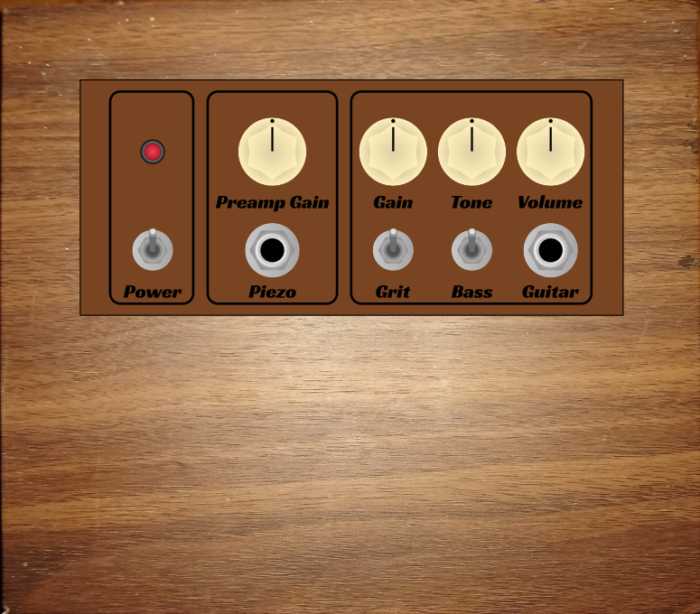 Whilst the piezo control may strictly be preamp gain, as it feed straight into the power amp then in reality it is affecting the channel volume. So maybe change that control to just say 'Volume'? It's what you'd get on a non-master volume amp. And it stops anyone thinking that the 'volume' knob on the other channel affects the piezo channel volume.