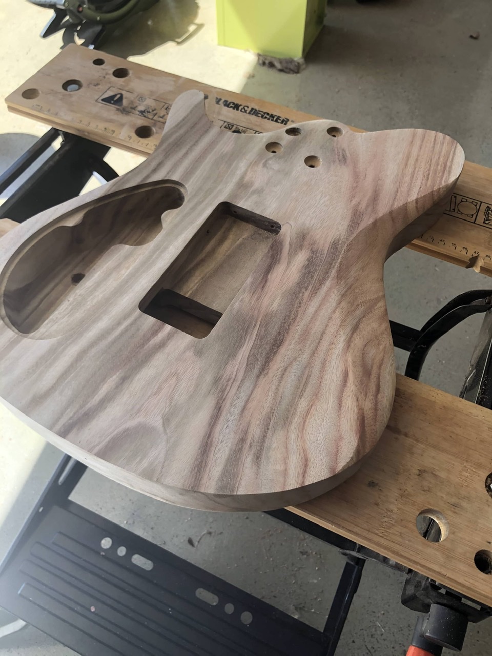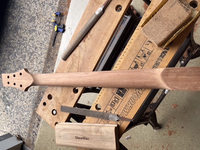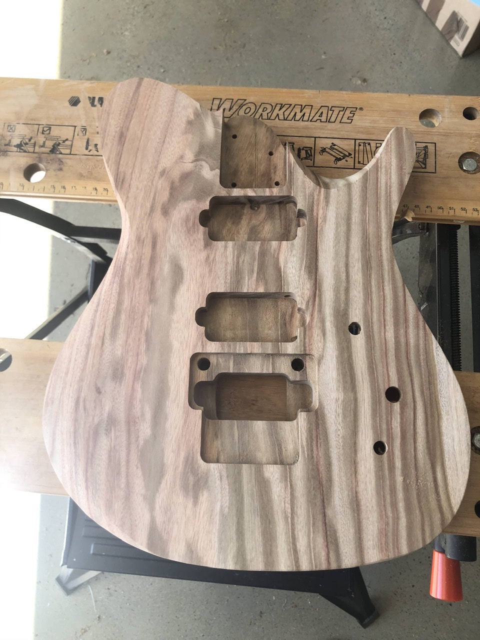 Bit of time to get back into it. Shaped the body with contours and rough sanded. Cut the headstock to close to desired shape and may finesse a bit before final sand. Fitted the locking nut so can start working on fretboard. Was going to fit some png ebony but not sure if something else would look better.