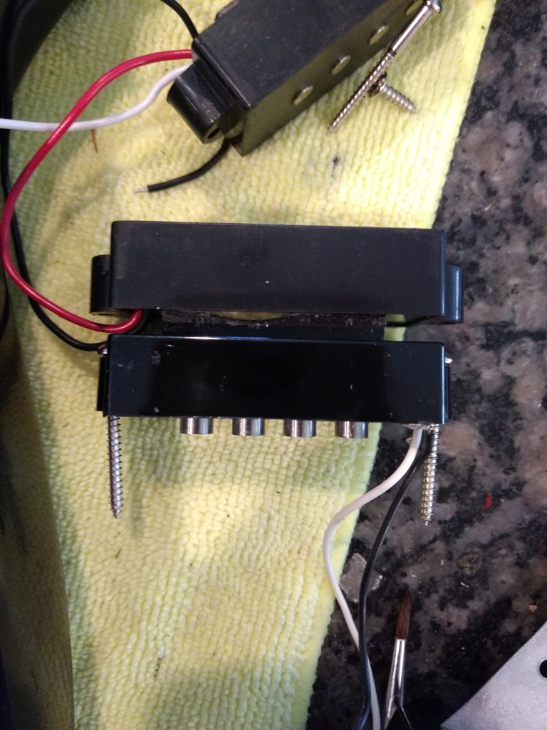 the first thing i noticed is that the mounting ears are much smaller than standard. looking at the photo the SD is on the bottom compared to the kit pickup on the top. the ears are smaller and the screw hole does not line up either. this would not be good for replacing an existing installed pickup. the other problem is the screw hole is so close to the pickup body that there isn't even enough clearance for the head of the screw. this caused the screw to go in at an angle that you can see in the photo.