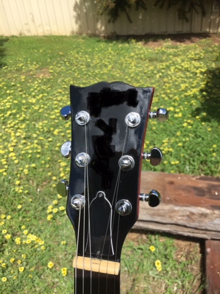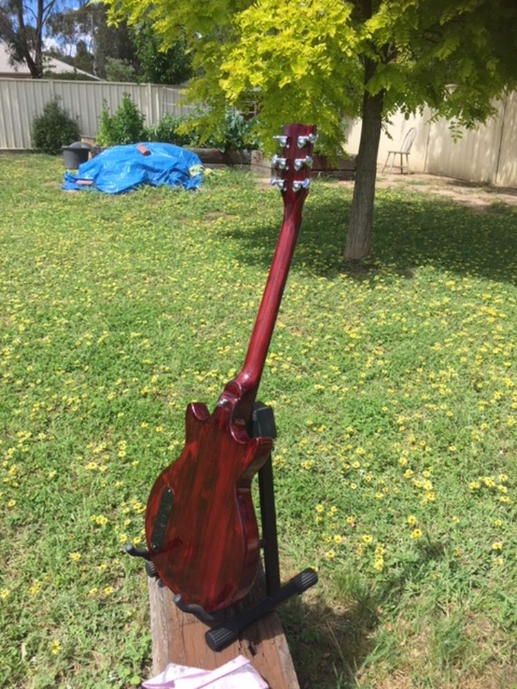 Pretty good effort for a first build, photos make seeing some details difficult. The overall style looks right and the mahogany stain is a good choice. Stain application looks a little uneven and may have been improved, by sanding back and reapplying. Shame about the headstock logos having to be blanked out. Action appears to be quite high, even with the bridge on the deck, so perhaps not quite enough break angle on the neck. Some well considered upgrades. All in all a solid effort and no doubt a lot was learned for the next one.