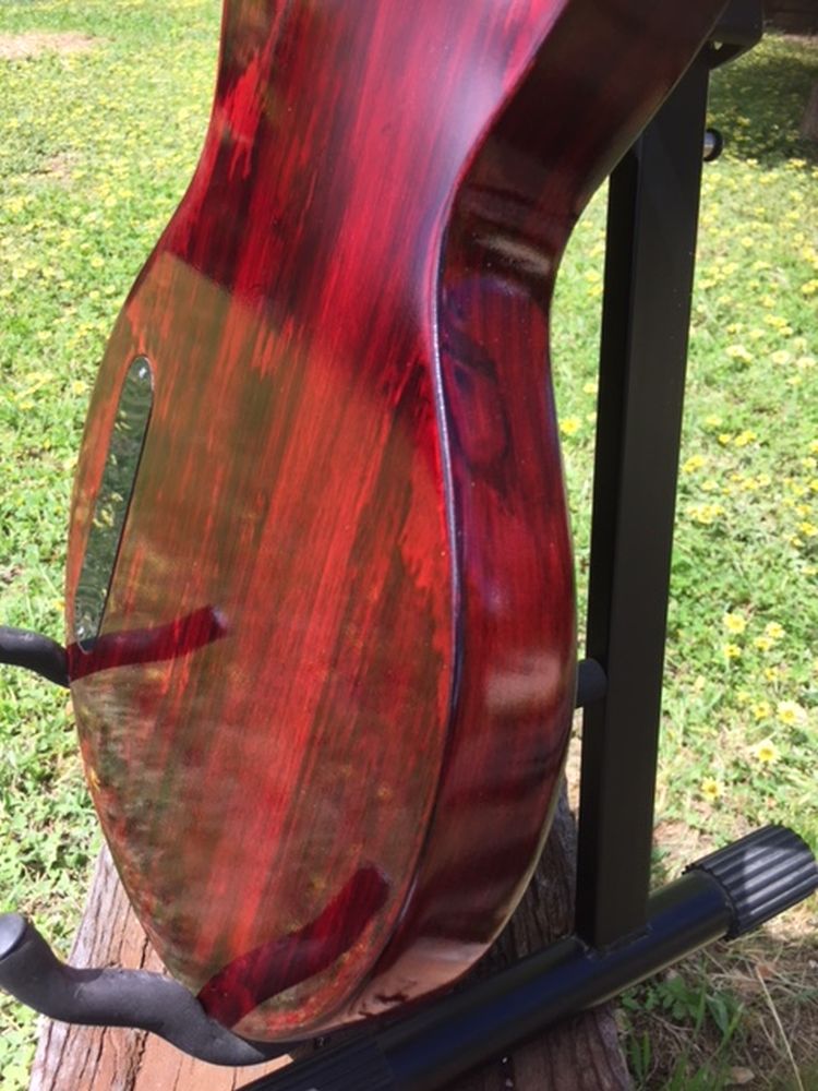 Wow, 36 builds and another fine example of your craftsmanship. Love the colour & tiger stripe look on the front. Definitely something I would want to own & play & will forgive you for no headstock logo on this occasion.