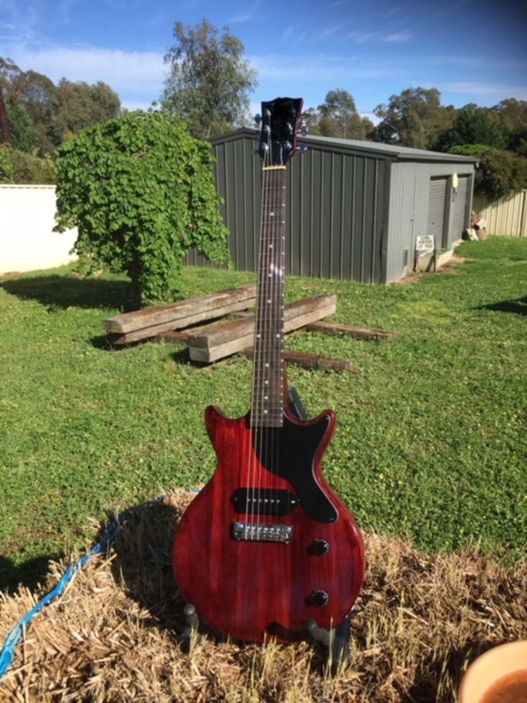 Double Cut Jnr on what looks like a Basswood body. Nice & shiny colour and the extra mods should make it sound great. Marks taken off for using someone else’s logos.