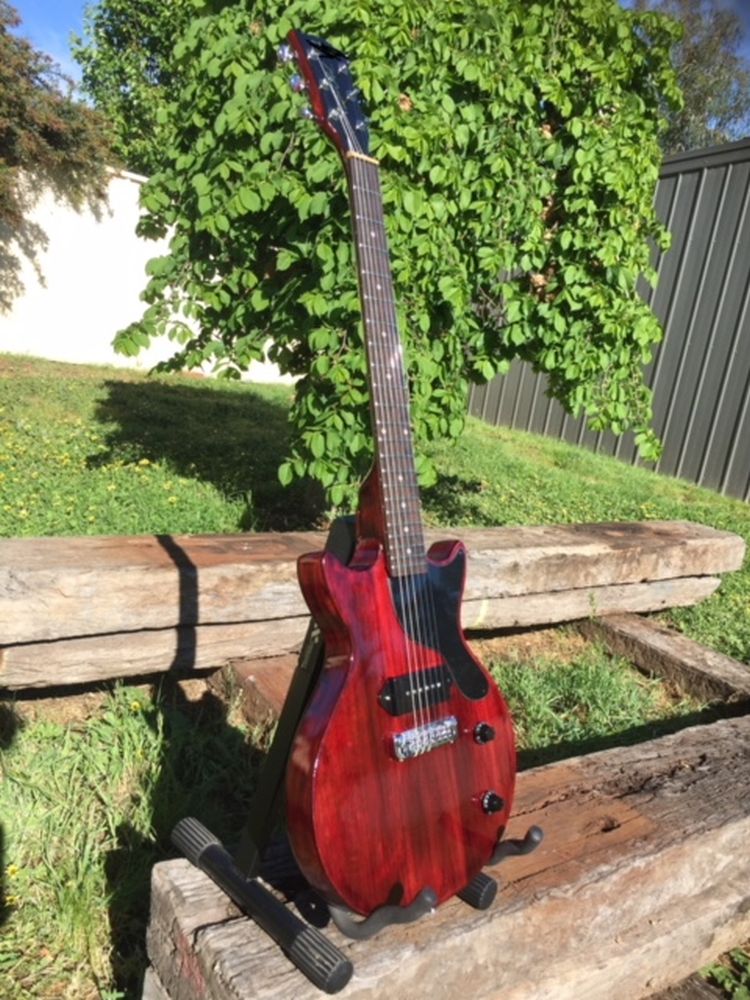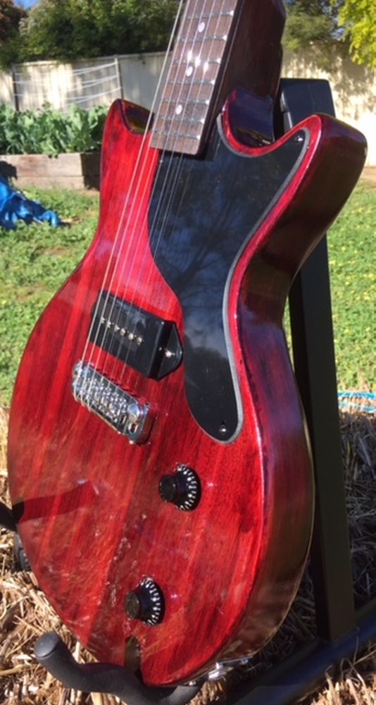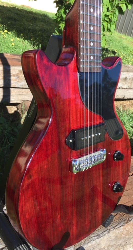 "Finished my junior style build. This is my first attempt at a kit. Used mahogany stain, Grover mini locking tuners, Martin A Smith hound wound P90 PU and I made the wiring harness using CTS 500k pots, cloth covered wire and 600v 223j Orange Drop cap.