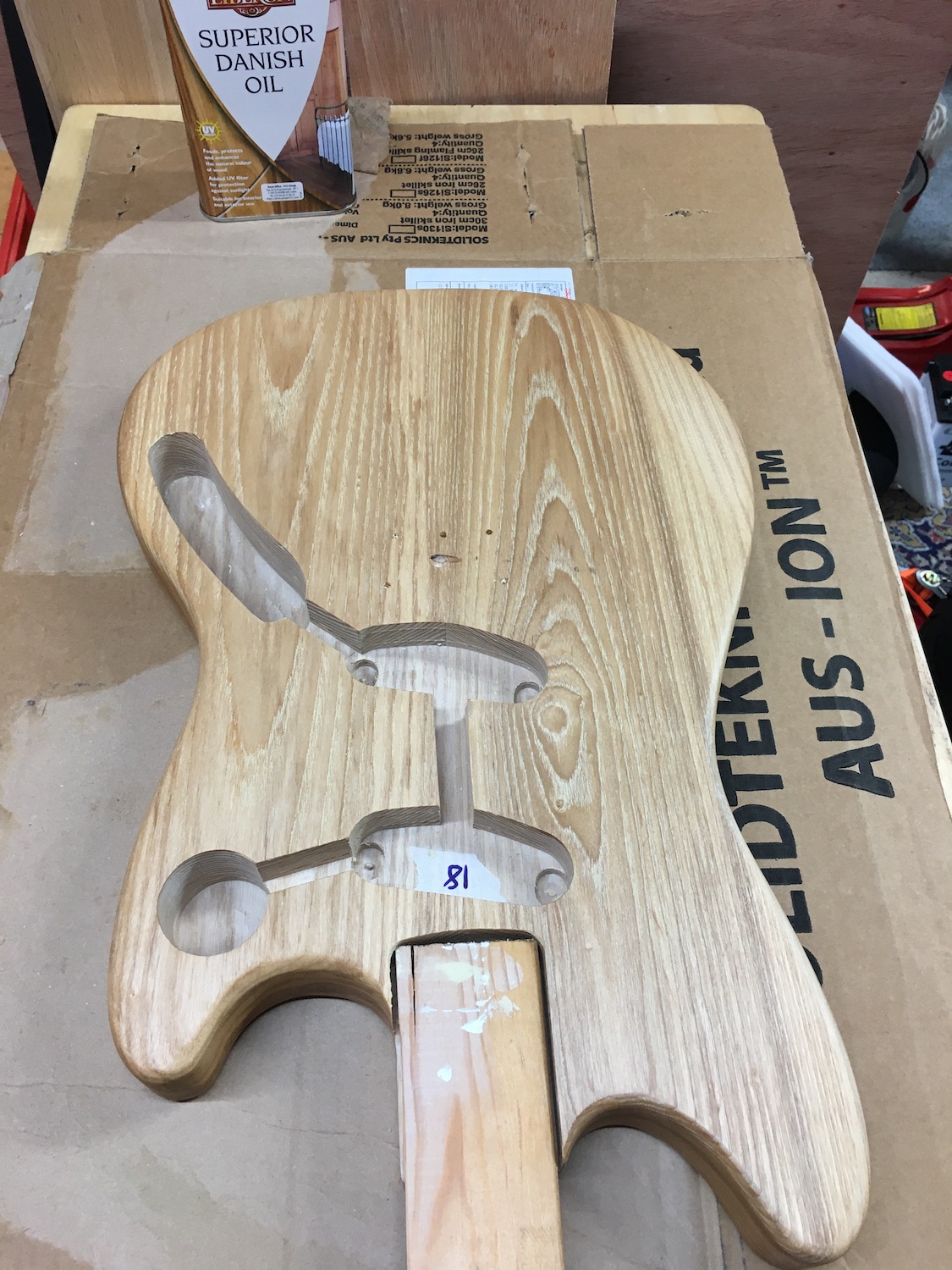 Body grain-filled three times then sanded to 240 grit with a machine, then hand-sanded to 360. First coat of Danish oil applied, only (insert large number here) more coats to go...but it does feel very smooth already.