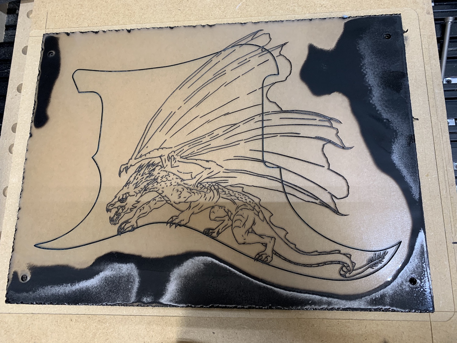 So definitely going to need to start over from scratch on this. The only question is, what's going to be the plan next time? I may end up getting some black acrylic instead of the clear and simply engraving the dragon into the front, then painting silver, then simply sanding and buffing it back smooth again. That's a tried and true procedure for wood, and I have the equipment to get the acrylic back glass smooth again. It would be a lot less complicated too, though the final product will leave the engraving portions on the top side where they'll fill up with dust and goop and other detritus during use...