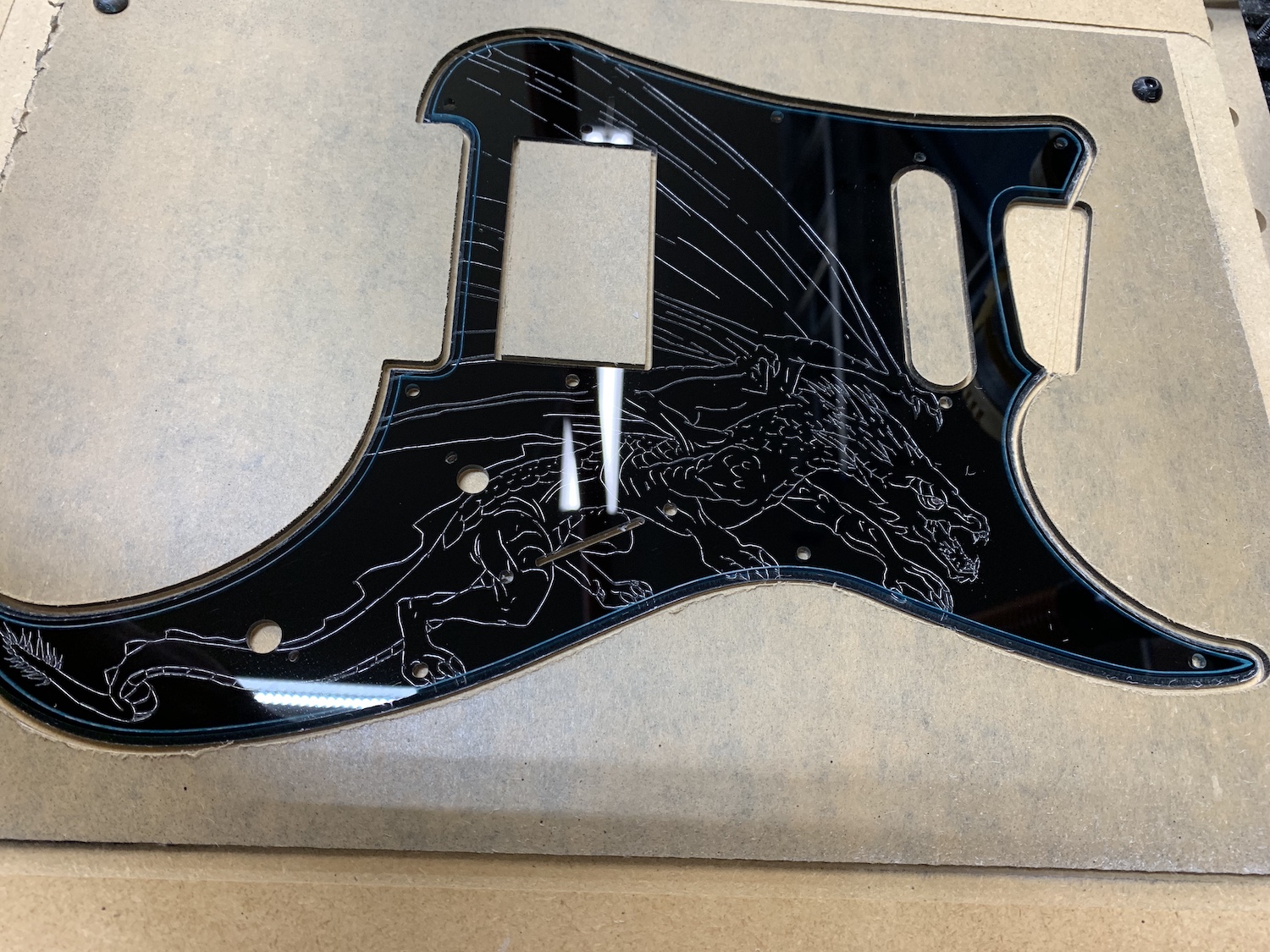 Overall it's not popping enough and disappears into the guitar once installed. I think I'll try making it again. For the next one I'll use the 90 degree bit everywhere and try to cut it a little deeper. I'll lose some detail, but should gain some contrast. I'll use red paint for the eye instead of the synthetic opal. I may try experimenting with flame polishing the engraving too - the more polished I can get the engraving the more it will reflect light and the more it will pop (I'll have to try that on scrap though). As far as process goes, I'll start with the engraving on bare plastic, then paint the silver, sand it back, then top coat with the black.