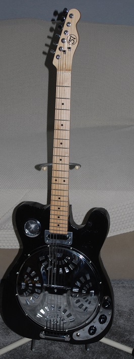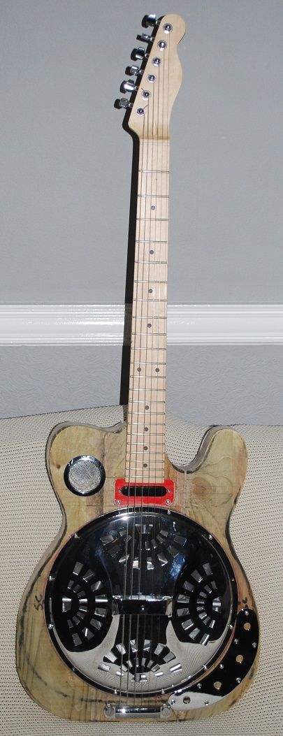 Well I finished putting it all together, though not too happy with the paint (automotive rattle cans) Probably rushed the prep due to workshop constraints too. I may revisit the finish at a later date and use decent nitro c paint. I used a 2vol 1 tone control panel, slightly modified MM type. It works fine but the piezo pickup is about half the volume of the neck single bar tele type. I sort of expected this, so may fit a pre-amp, for now running with the neck at half works fine. The resonator sounds authentic, with a metallic, banjo-esque tone which is nice for picking. The neck pickup is capturing some of the resonator tone and is deep and solid. With both on it has a good usable tone with a very acoustic feel at low volumes. I have not yet put it through the AC30, but through the Pignose at full volume the piezo feeds back like Hendrix on acid! Acoustically, the guitar is loud enough to not need an amp and has a nice resonator tone even with the light strings that I have used (EB Slinky 10-46) The action is pretty much Ok and will be finally addressed when I fit a brass nut so that all contact will be metal to metal. With heavier gauge strings I believe this would be a good slide guitar. I finished the headstock with roller trees and my circle37 logo