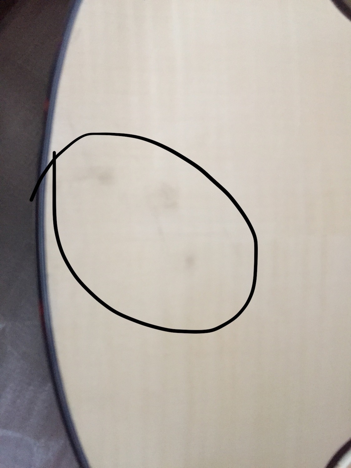 Marks (sorry the photo is blurry, and I should take another one to enhance it, but I can't ascertain what these three marks are - I don't believe they're a natural part of the wood's appearance, and if it is, surely it shouldn't have been used for the top?!