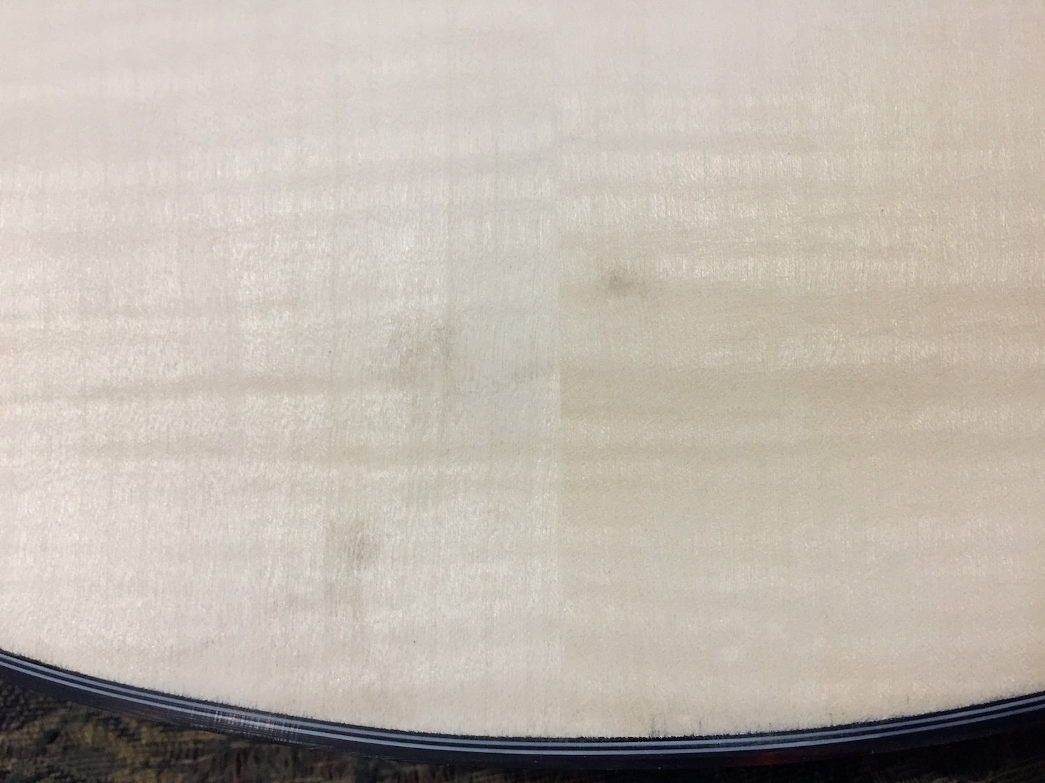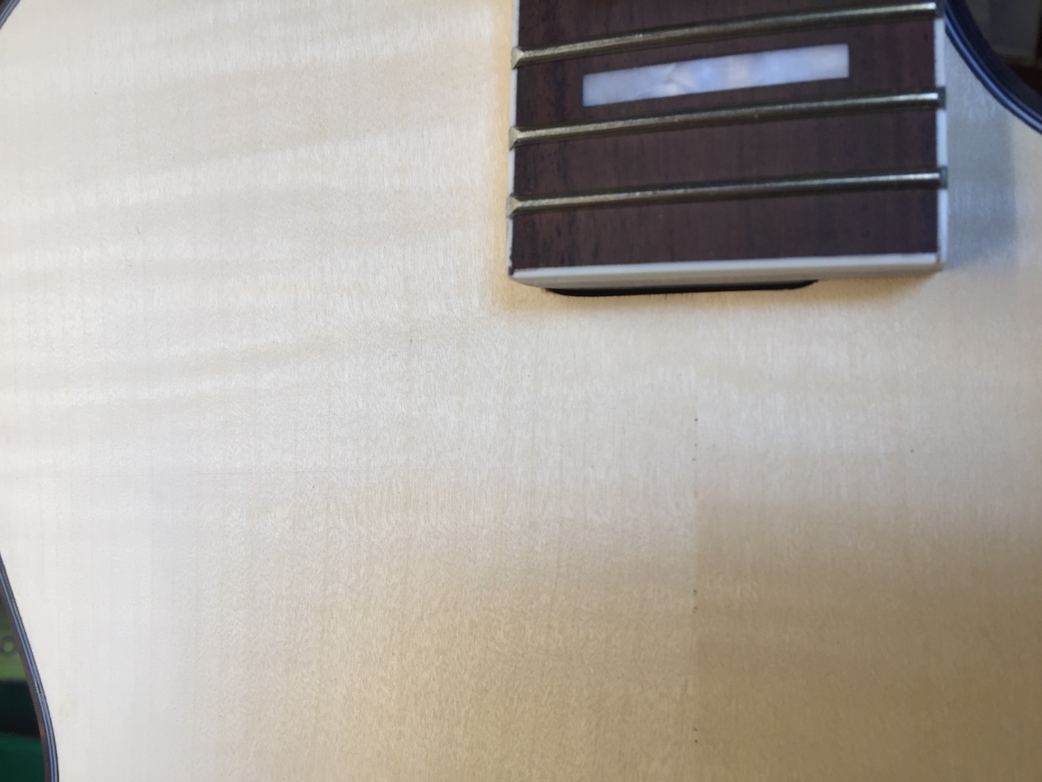 Binding alongside neck joint, front to back - poorly finished, binding not even fully going to edge of joint...