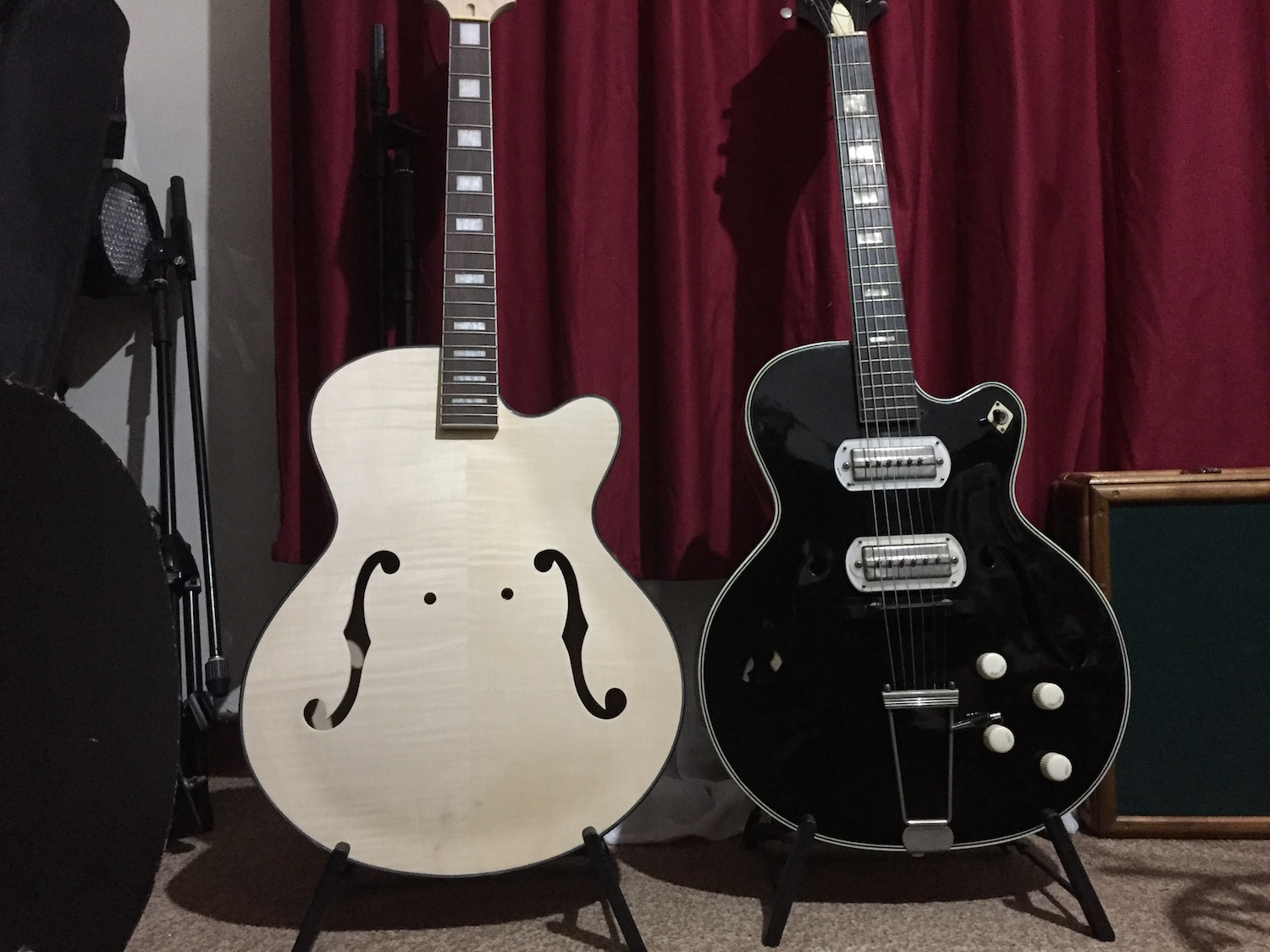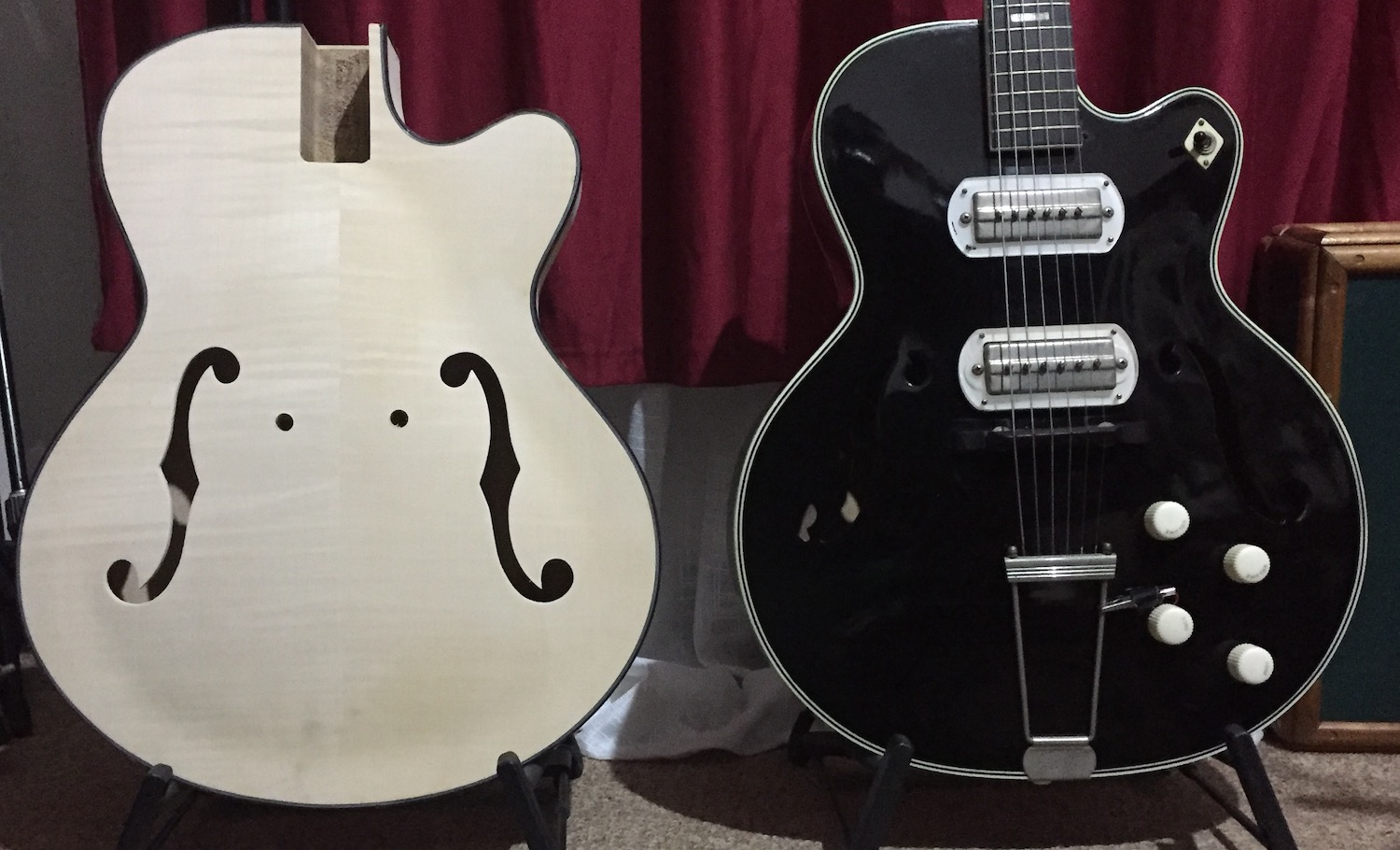 Here's a couple of pics of the kit body, alongside the Silvertone 1385 (aka Black Beauty), essentially the same guitar as the Harmony H62, to check body proportions. The Silvertone is 3 1/2" thick, and the kit is 3 1/4" thick. The Silvertone is a bit rounder in the bottom bout, and the kit is a bit wider in the upper bout, making the cutaway a bit bigger. The Silvertone neck is substantially wider (60mm at end of fretboard), and the kit is around 55mm. I don't think that the neck will be suited to the extra wide pickups, which are 56.5mm bridge, and 52m neck. Maybe all is not lost, as pickup maker Curtis Novak has just (literally last week), mentioned he's in the process of making reproductions of the P13s, with a 50mm polepiece spacing. At $175USD per pickup, I not about to buy something I don't need, but if I can't get the string gap right, I may have to fork out (ouch)...