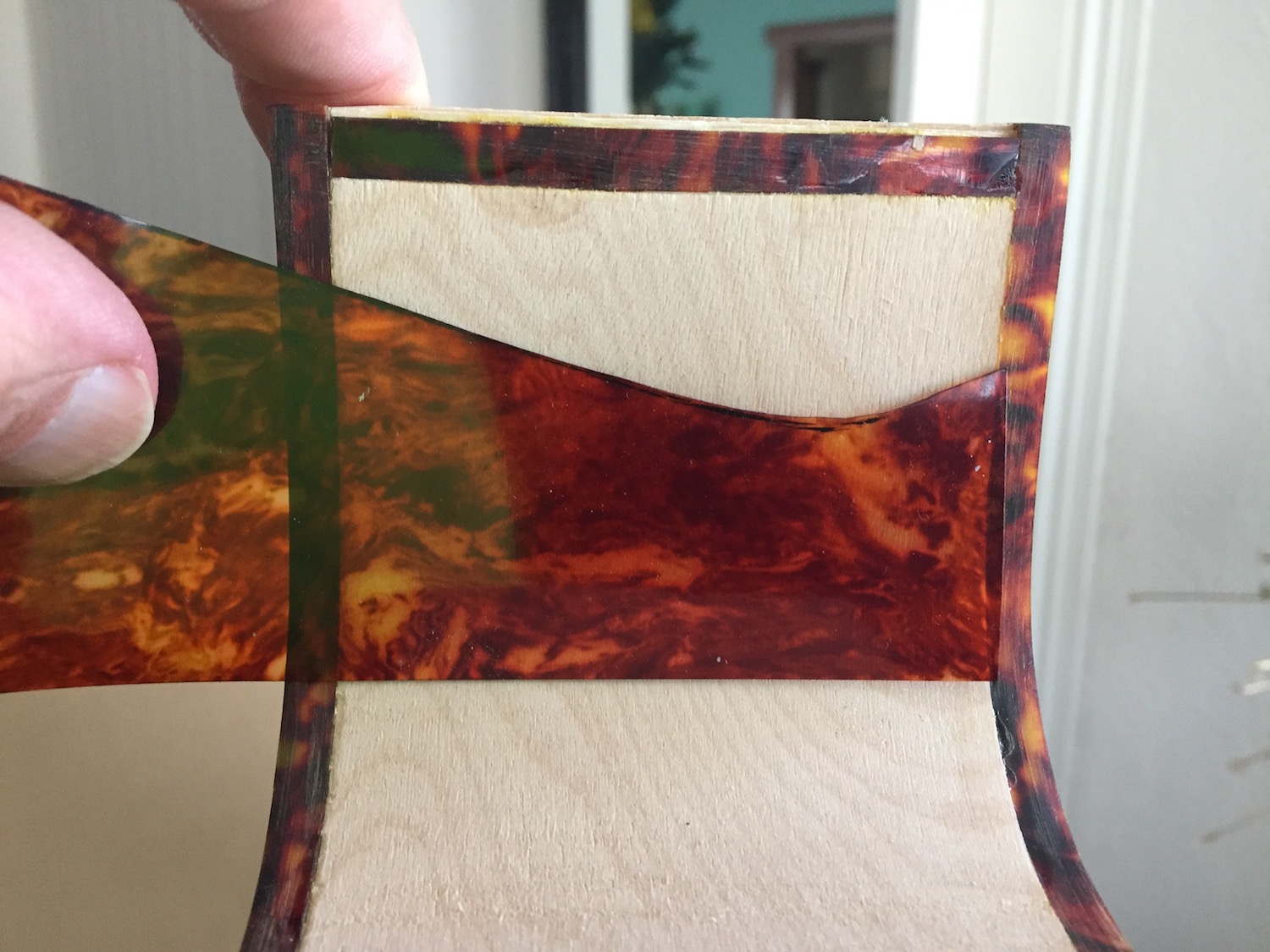 Only pics I'll update are the tortoiseshell binding alongside the neck-pocket, front to back. I was tossing up between simply re-using the piece of binding, and fixing it 1 mm away from the veneer in the cutaway to get it flush with that corner, (meaning I'd have to use natural putty to fill a gap on either side of that strip), or make a replacement strip 1 mm wider out of some tortoiseshell I have here. It's much thinner material, so I cut three strips of required size, and used acetone to stick them all together, and make up the same thickness of the original. Now of course, it's really dark compared to the rest, with none of the light tort patches lining up together.