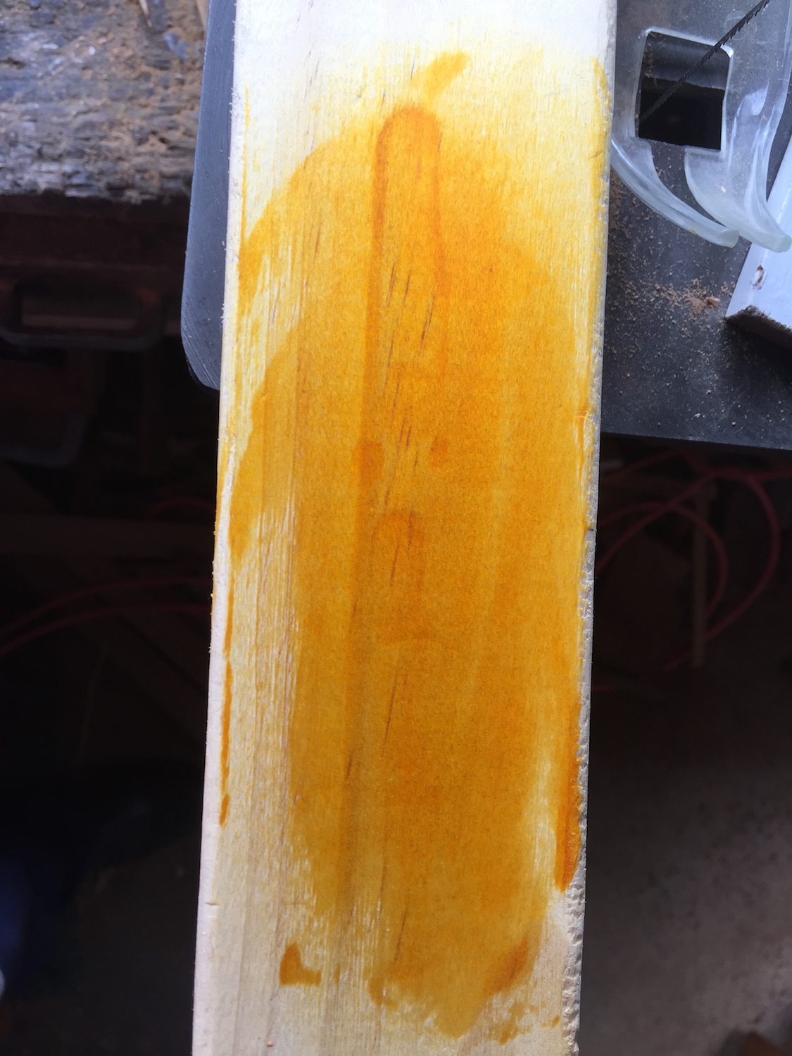 Here are a few pics of Coolangatta Gold on some scrap pine stud, (closest I had to the shade of the guitar body), and as you can see it's pretty strident. Pic one is the stain, second is just the intensifying coat (a bit darker), and third is both of them next to the guitar body.