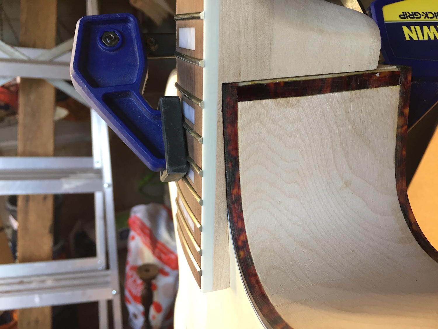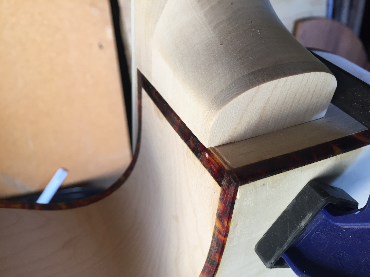 Anyway, I'm not sure yet how to make the end of the neck work, but I'm going to cut some tortoiseshell to replace the binding alongside the neck joint from the front to the back. I just can't come to grips with the timber showing along that edge, where it should be covered by the binding, and I have no idea how they could've finished it like that. The tortoiseshell material I have is thinner, and not as dark, but if I cut two strips, and make it double thickness, I reckon it'll look better than it currently does