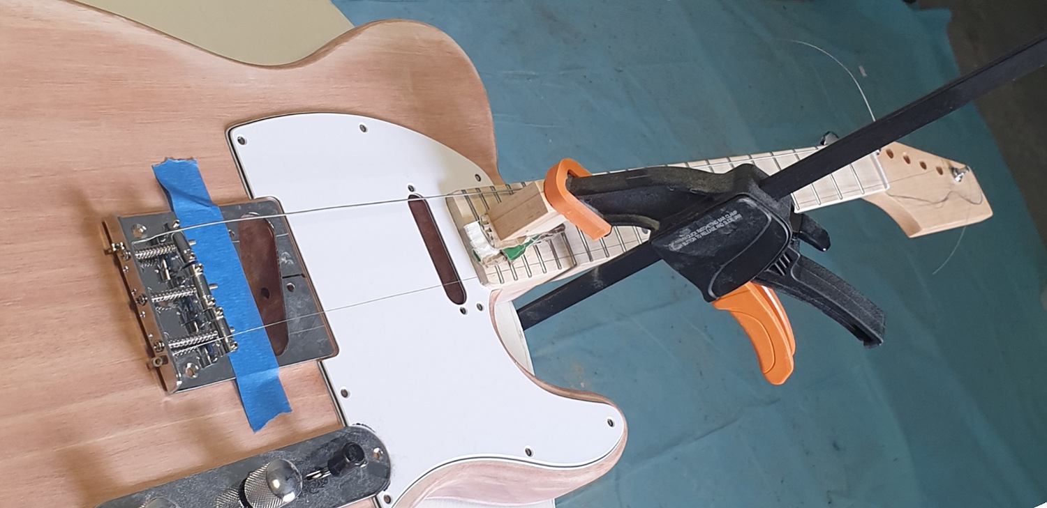 I did a more precise mock build and ran both the e strings up to check the placement of the Bridge. Happy with the scale length and positioning I drilled the 3 holes using a 2.5mm drill bit.
