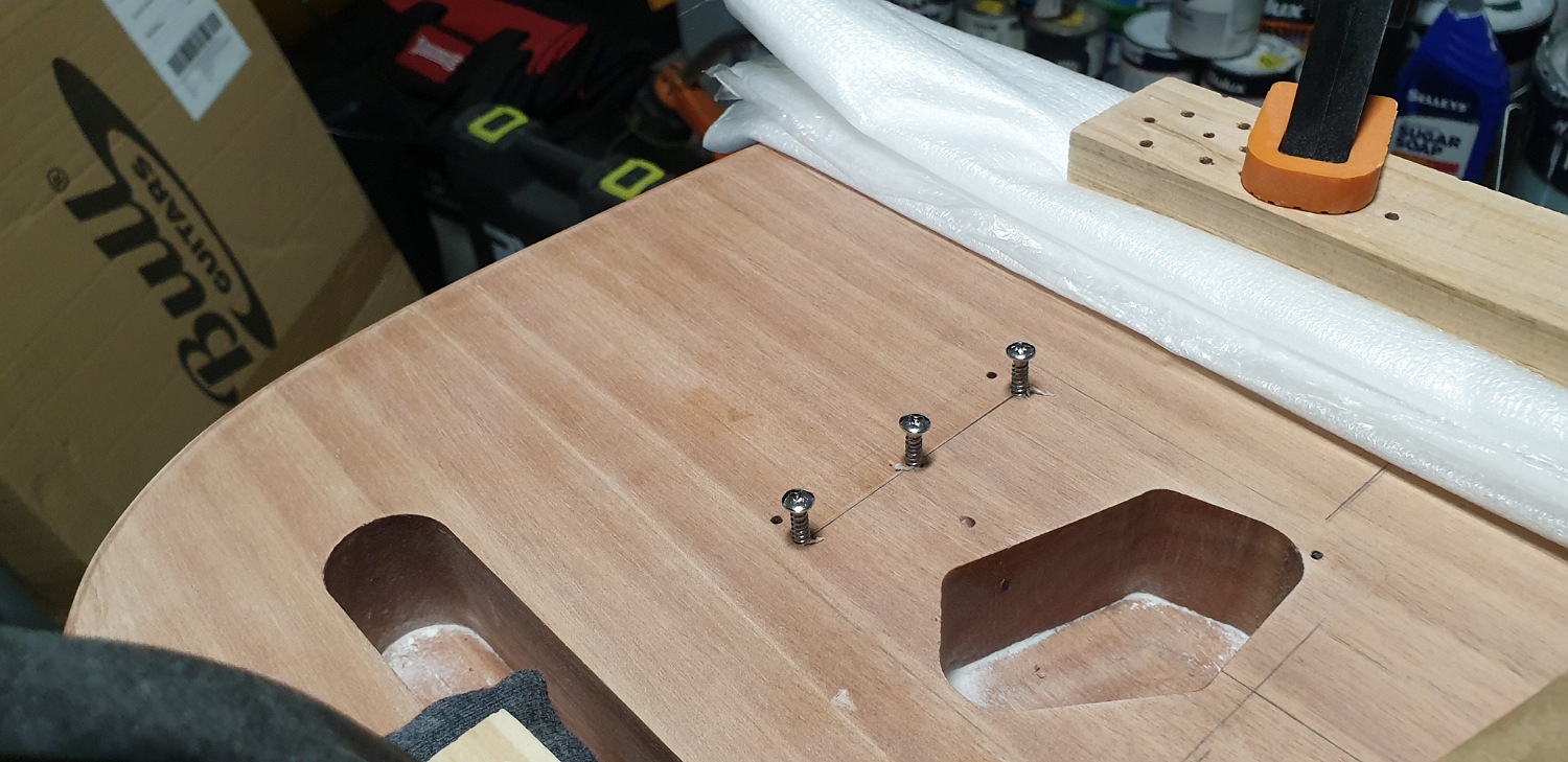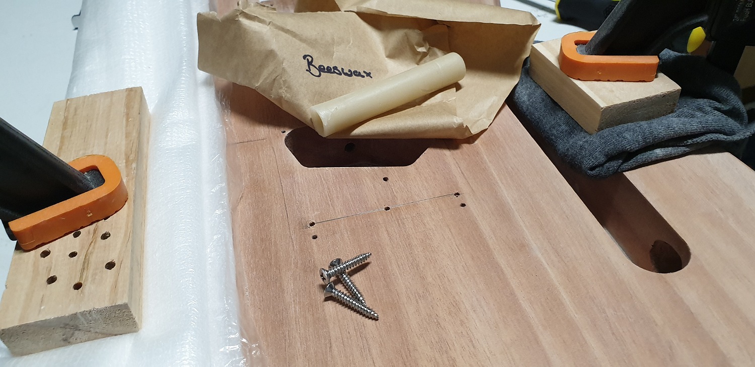 From there I coated the screws with some beeswax and threaded them half way in, then removed them to place the bridge and thread the rest of the way