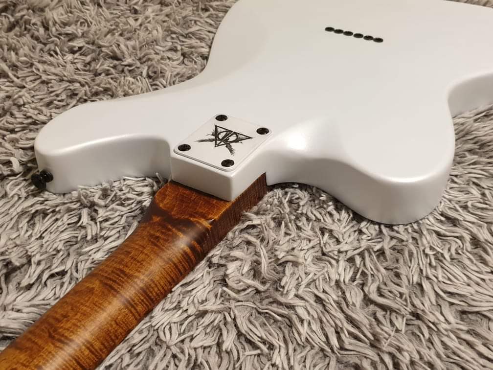 Body routed for humbuckers, with fret access carve, finished in automotive pearl white and satin clear coat,