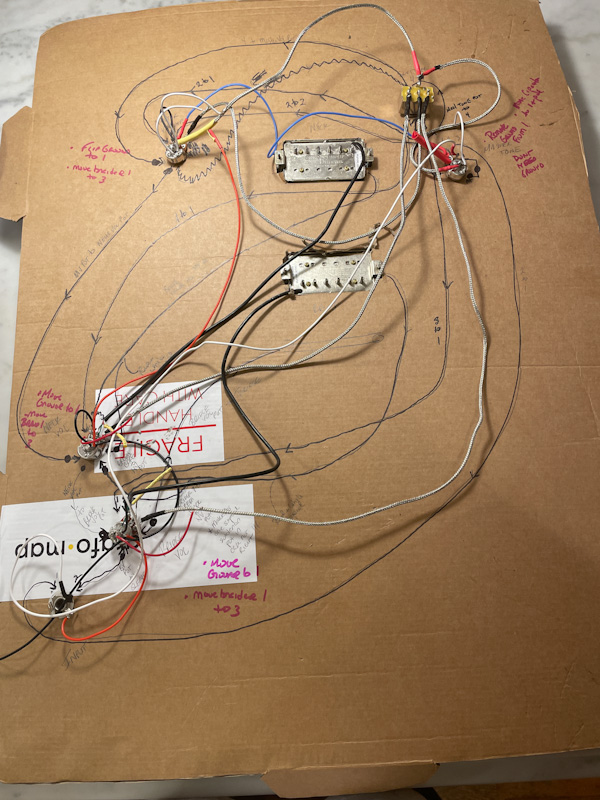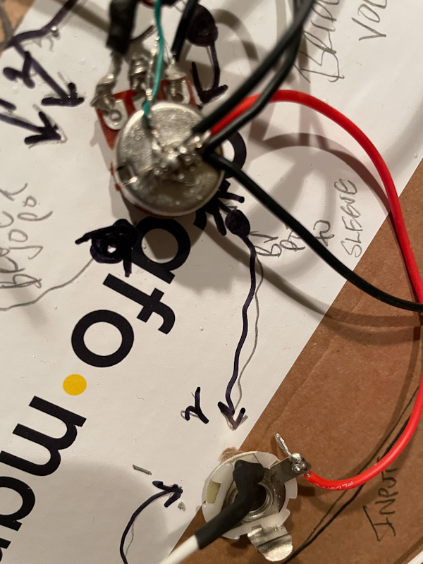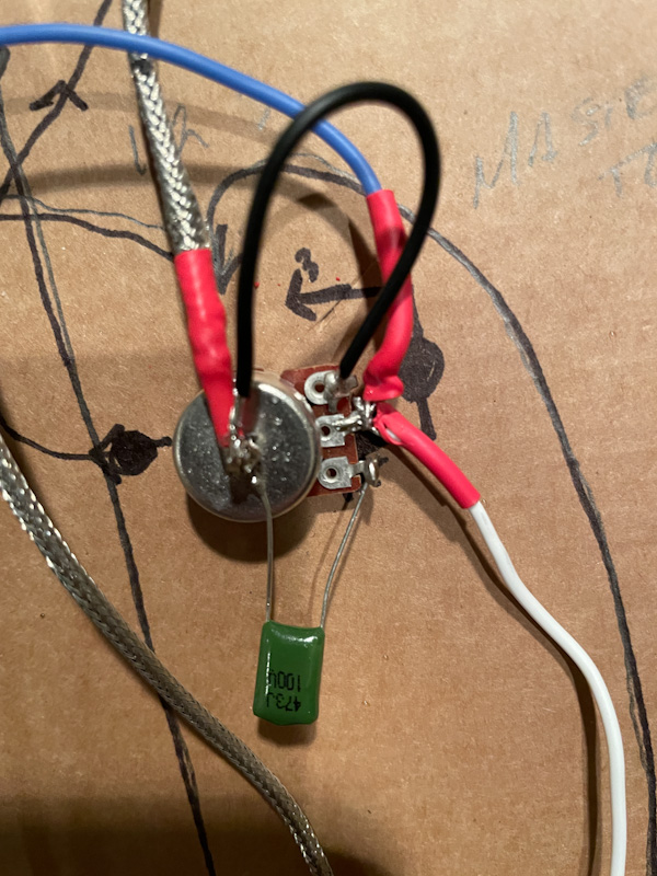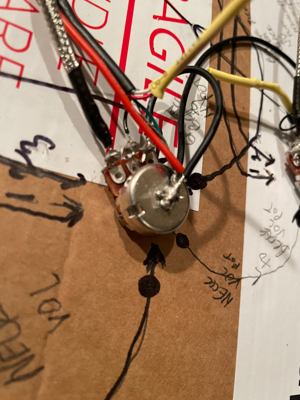 My pot leads are not long enough to bend back to touch the pots so those short black wires are there to just jump to ground to the pots (of course, from my mistake above) they are all on wrong side now). And I see that the third lead on the master tone pot does NOT need the ground back to the pot.