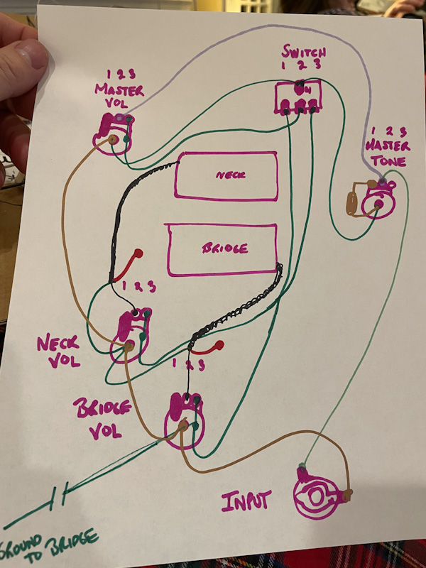 I had high hopes with the suggestions offered above but still have a hum - though lower in volume it is still there. New problem is neck pickup doesn't work. I have attached pics of the new wiring harness and a (prob easier to read) schematic of the connections.