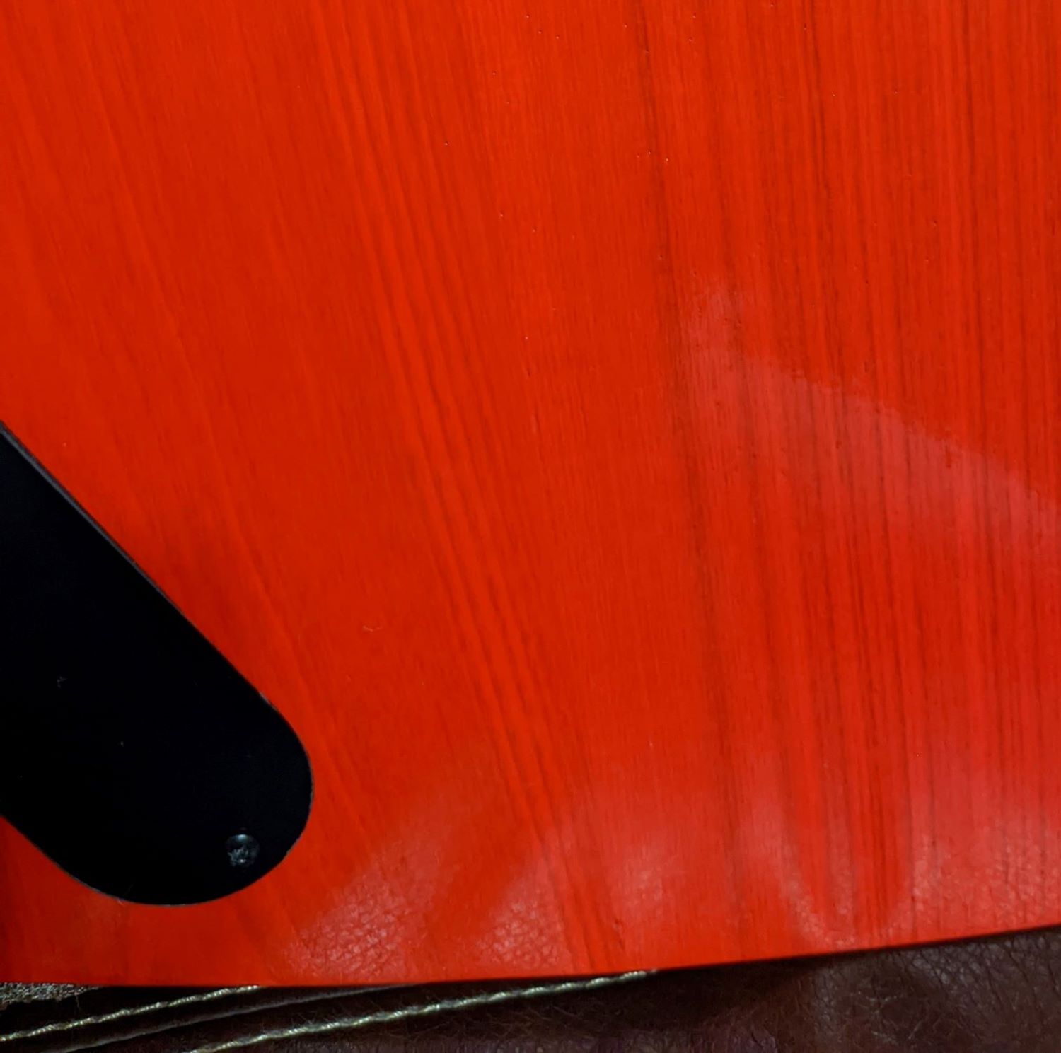 Red hot guitar and lovely. Love how the strings match the body and neck. Great overall effect. Nothing jarring and effective looks.