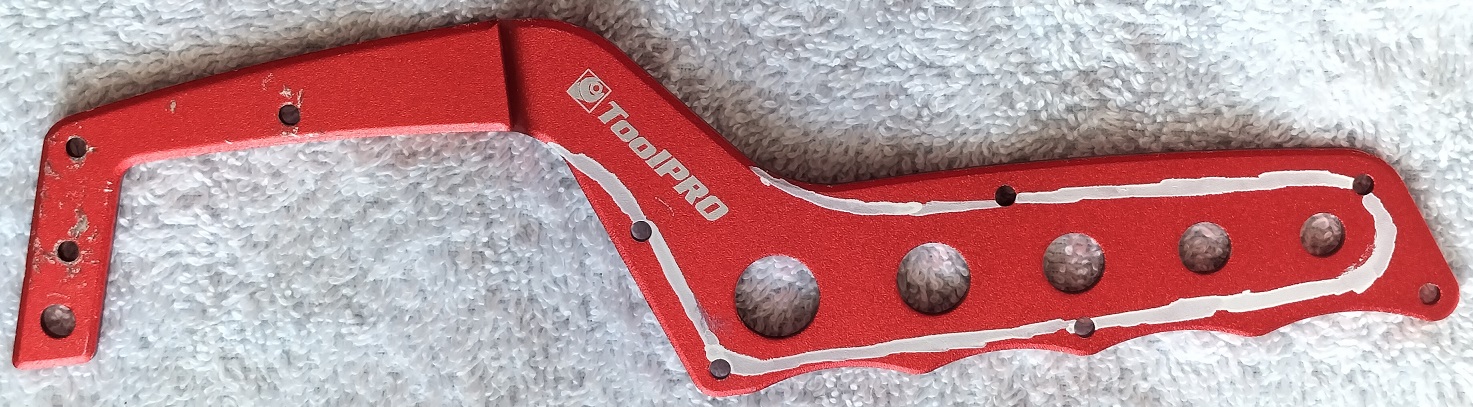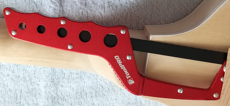 Thanks for chiming in, Jim. I considered the possibility and found one solution here (https://www.talkbass.com/threads/hea...2-etc.1304234/). Thinking that a little untidy for this build, I've been keeping an eye out for similar strap extension bracket solutions. In Supercheap Auto this week I happened to spy this mini hacksaw with a difference. I've only ever seen these with a moulded plastic handle, but here is the same tool with two metal side casings and a plastic filler. It dawned on me that ripping out the rivets would leave me with a suitably shaped bracket and the crease/dog-leg in the middle would conveniently allow one (the skinny) end to be inset into the neck heel and subsequently buried within the neck-body mounting. The exposed piece could use some shaping, depending on its strength. The whole tool is quite lightweight and possibly aluminium, so I wouldn't want to weaken/reduce it too much if that's so. Will see what I find when I deconstruct. I'm seriously going to consider this. Nothing lost if this $12 trial feels too flimsy, will keep my eye out for alternative solutions.