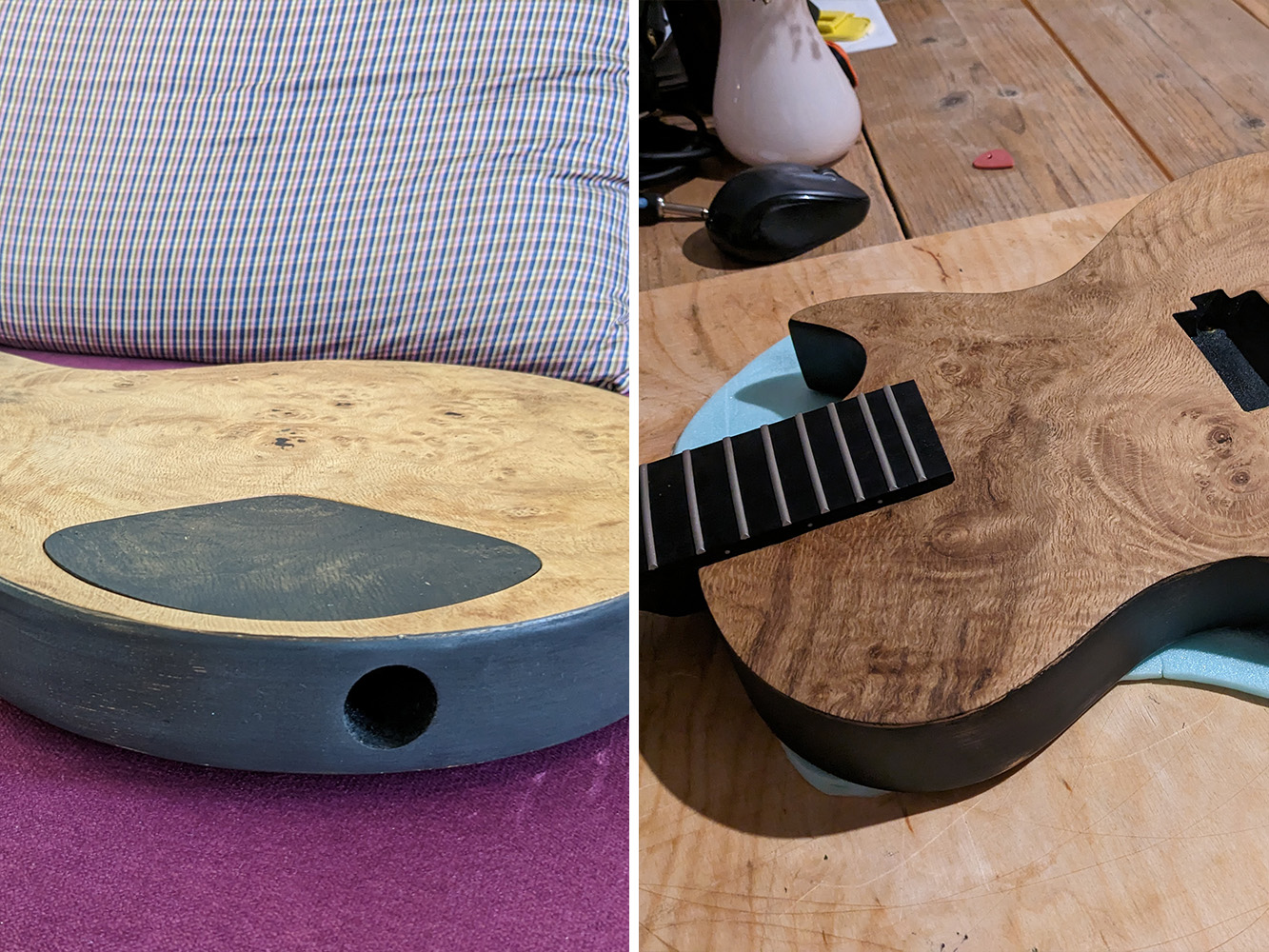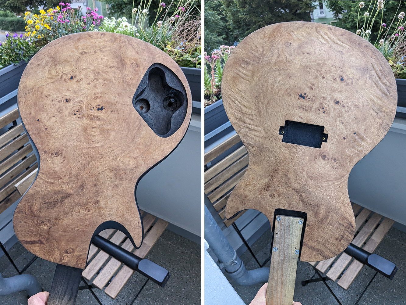 The wooden parts get some coats of clear semi-gloss/mat finish and that will be the final solution for this two colored guitar.