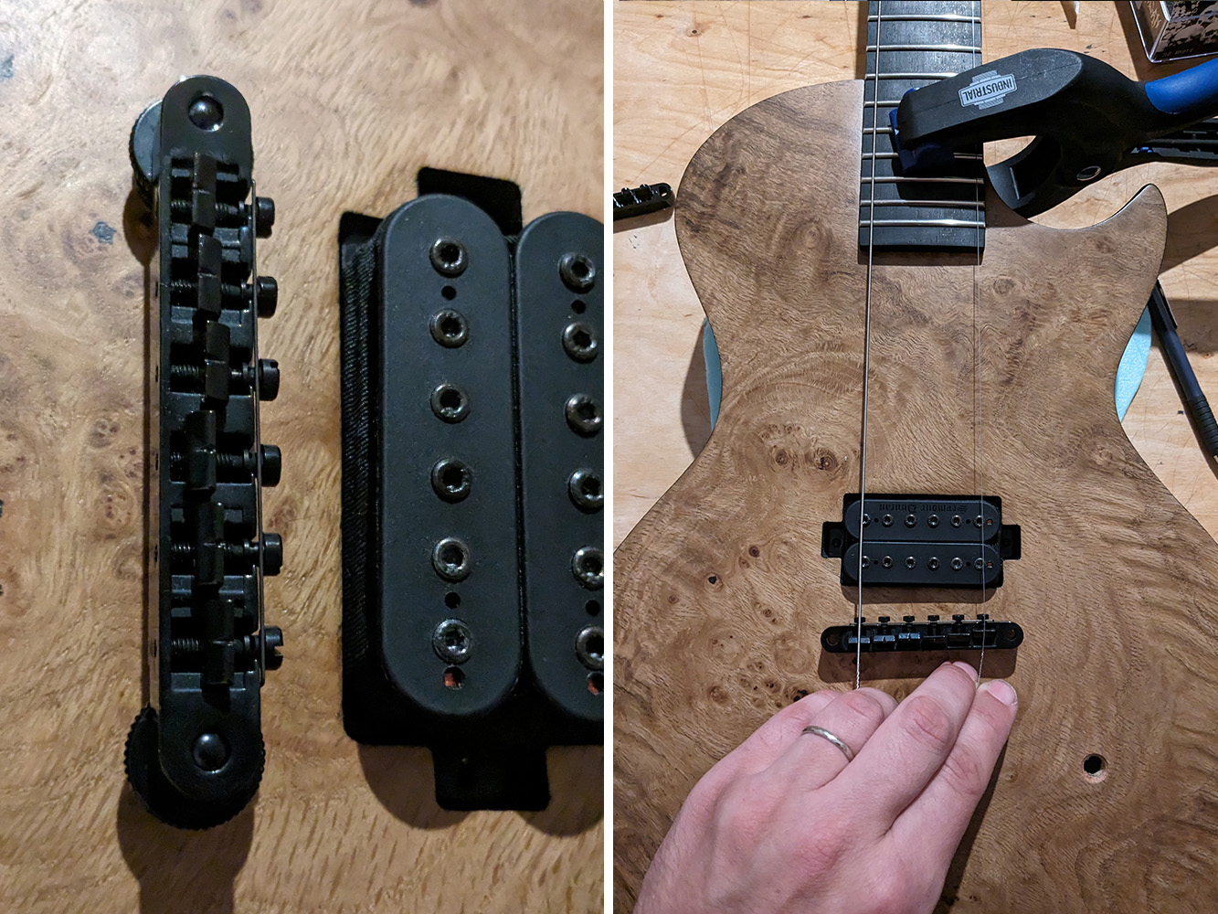 The next steps will be adjusting the bridge (maybe should have done it at the beginning), the string through body drilling and the neck mounting. Not sure about how to get a small hole to the bridge for the ground wire. From which direction to drill. Through the jack entrance with a small handdrill maybe?