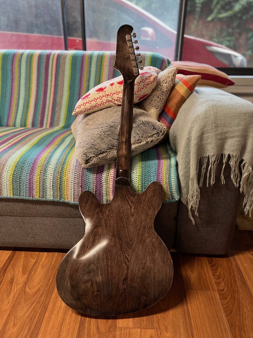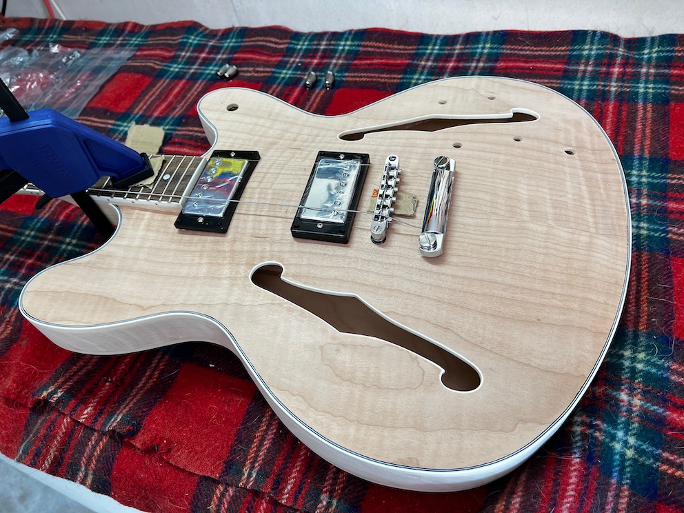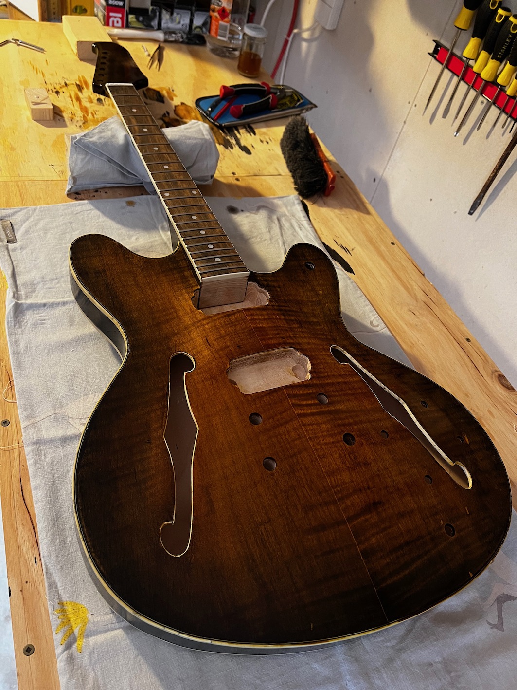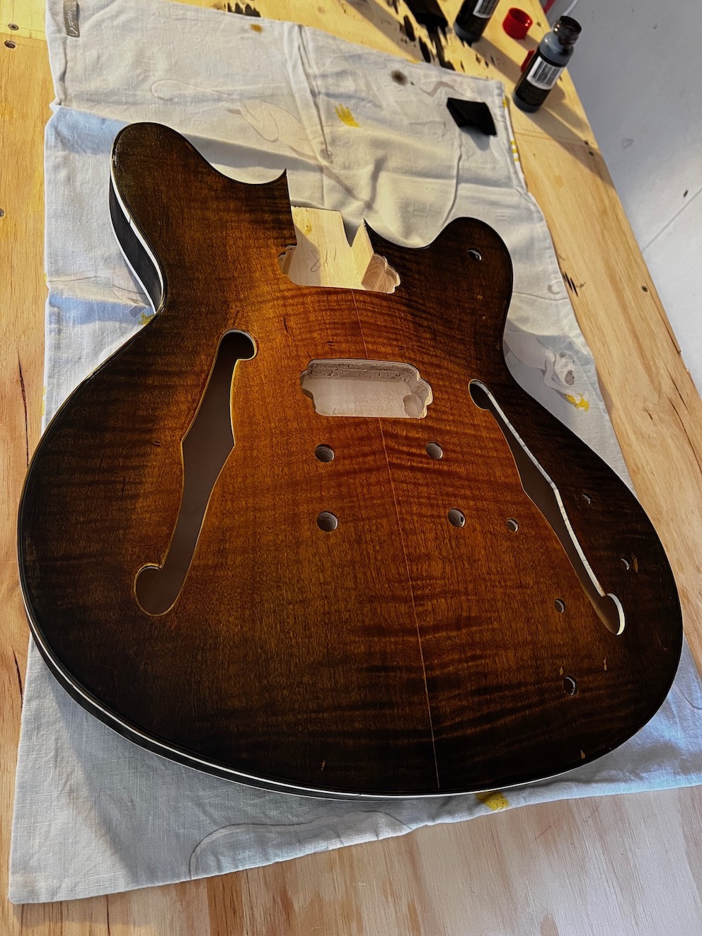 I'm going for a hand rubbed tobacco burst finish. All I've done so far is make sure all the bits are there and I've started practicing some burst techniques on scrap pine.