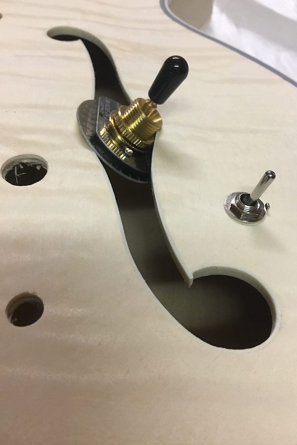 First, I’d get some paper and make a rubbing of the holes, including the f-hole, and use that to cut your cardboard template. Then it’s time to work out where you want your mini-toggle and how you want the parts oriented to each other.