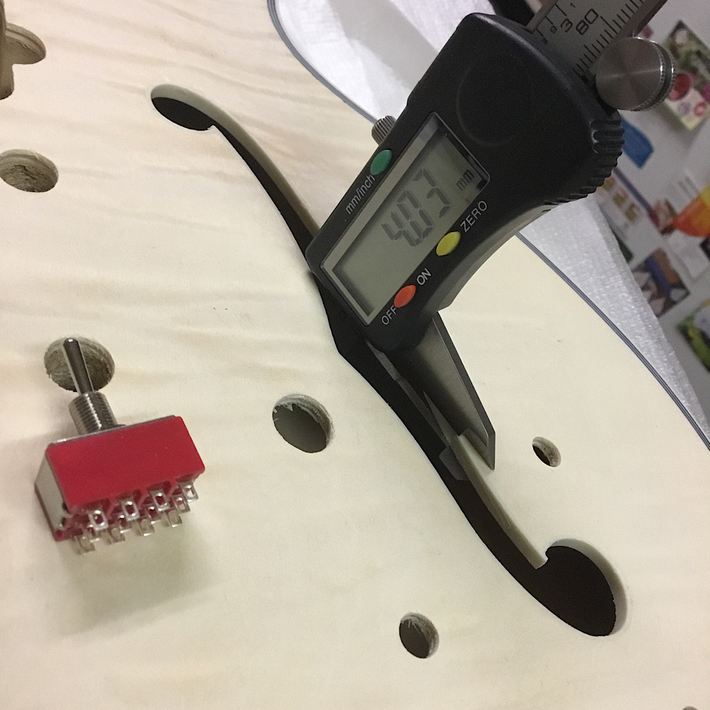 I’d make your cardboard wiring template up and mark on the f-hole location before putting the components in place. Don’t forget that you’ll be fitting everything from underneath, so mark the template ‘top’ and ‘bottom’ and fit everything on the bottom side (I’ve got it wrong before myself).
