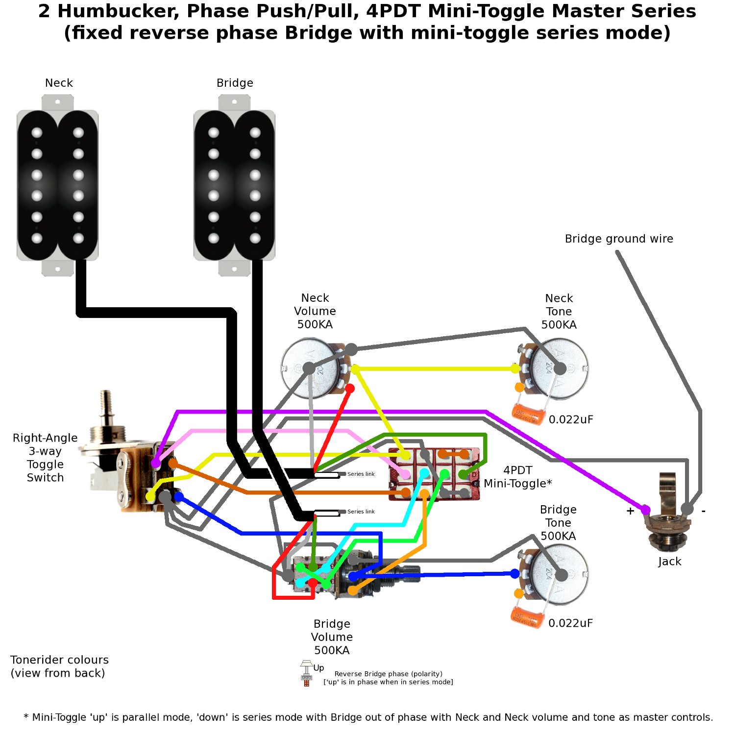 And so I can have my cake and eat it too, would it be simple enough to wire this with one push/pull pot that changes the phasing of a pickup? That way, I imagine I could retain the option of out of phase (polarity) in parallel via a push/pull pot, as well as have a one-switch single fixed series configuration with one pickup out of phase (polarity). I assume that if this push/pull pot was engaged with the 4PDT mini toggle you're suggesting, that it would then be in-series/in-phase.