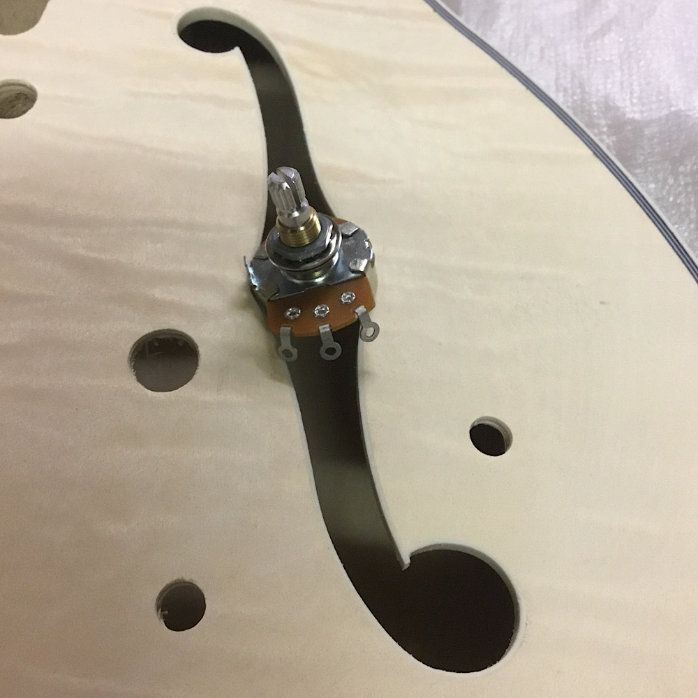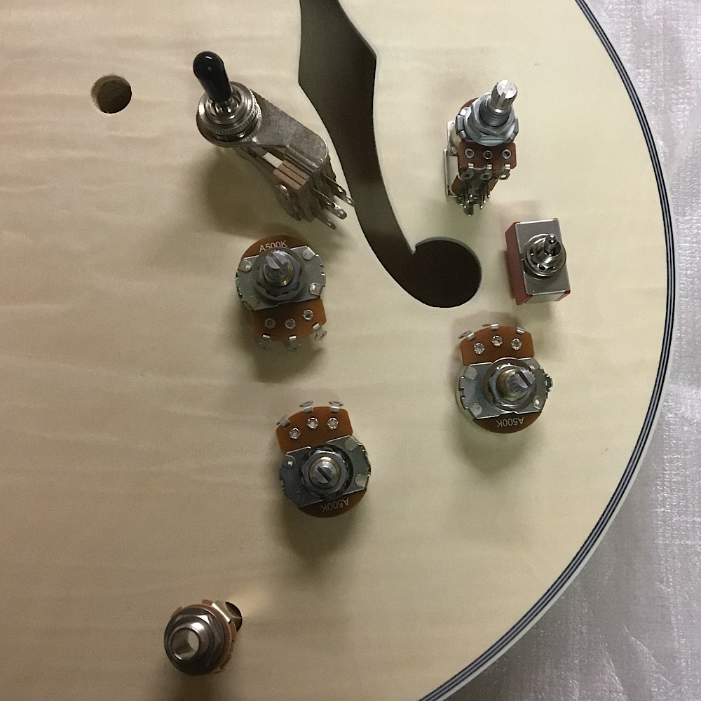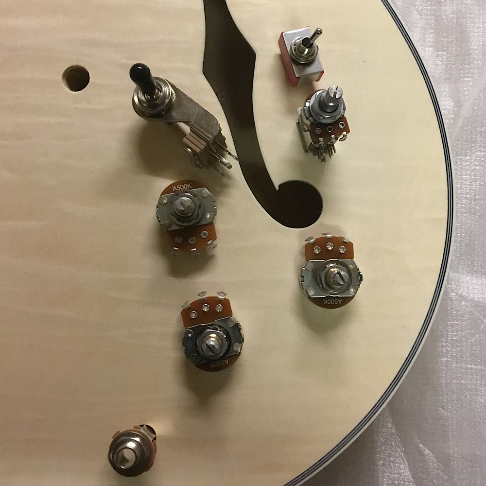 … you also need to consider how you will need to manipulate the components to get them through the f-hole once everything is connected. The jack, push/pull and mini-toggle will all fit through the f-hole easily but once wires are attached it can become more tricky.