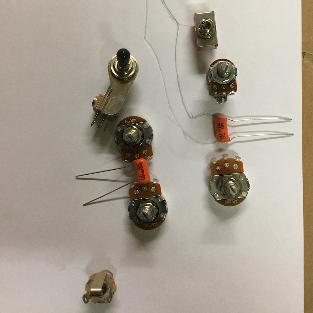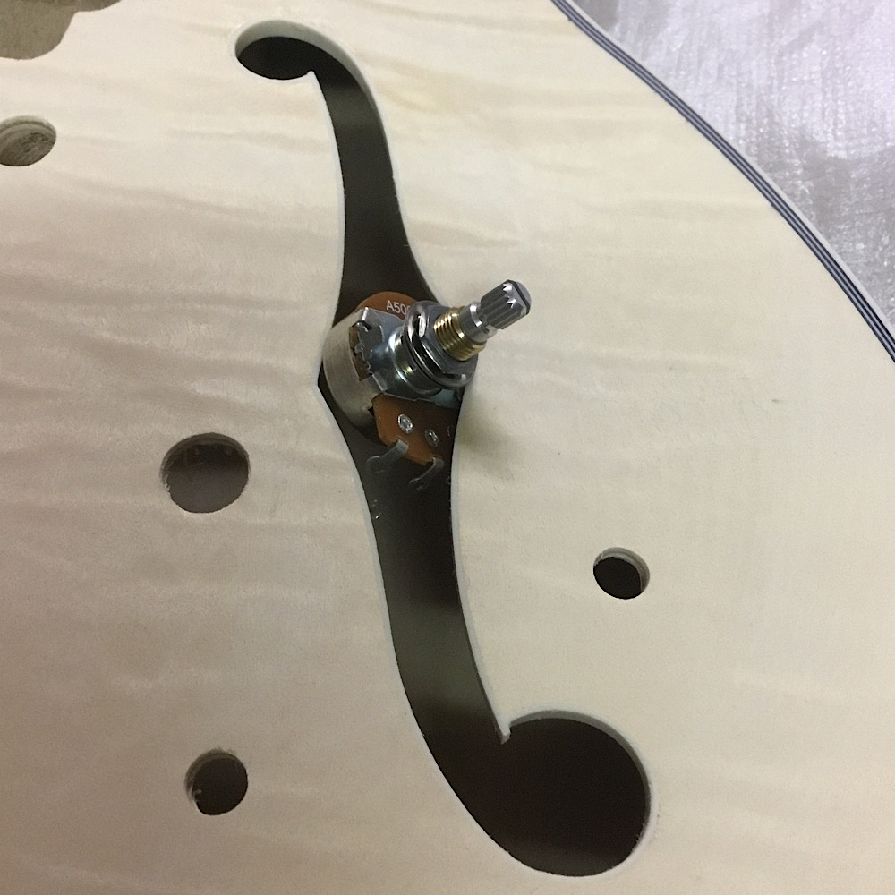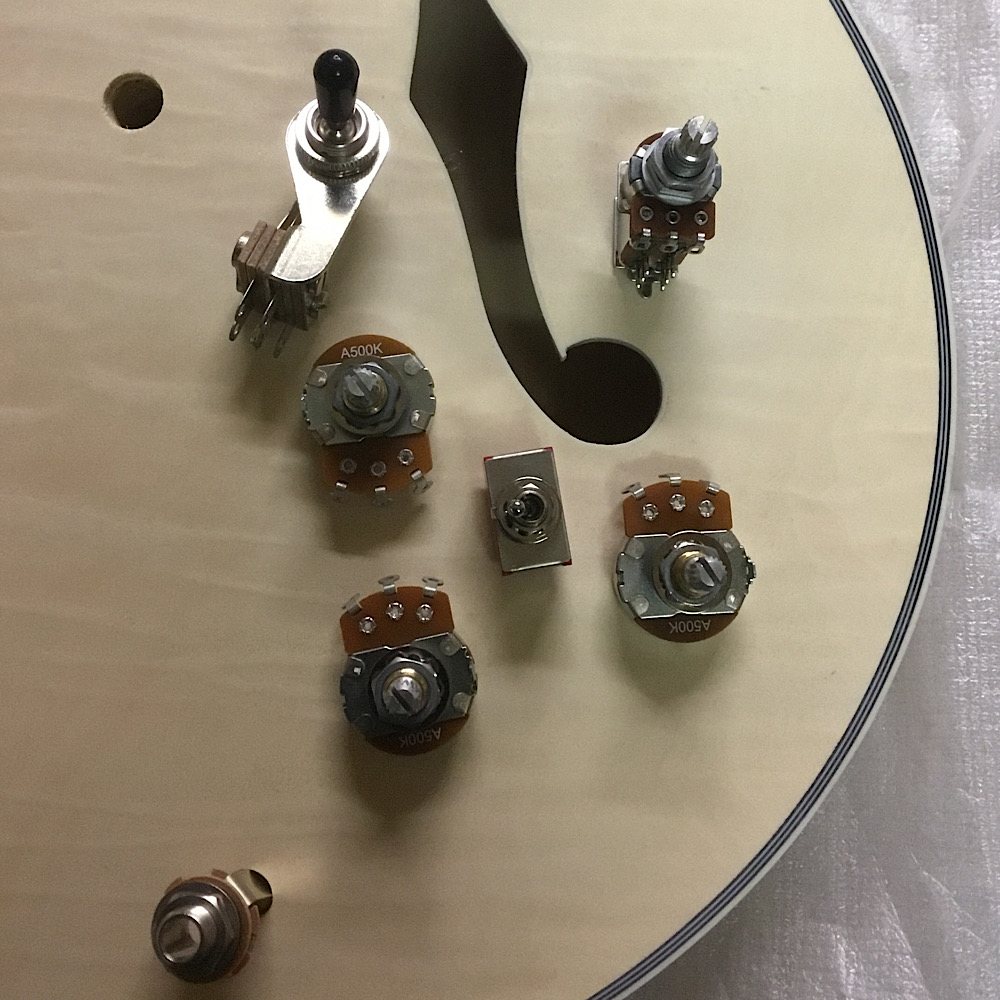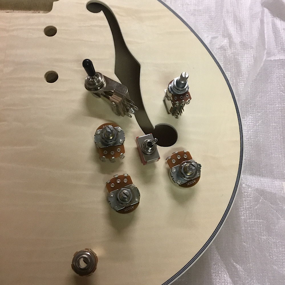 … you also need to consider how you will need to manipulate the components to get them through the f-hole once everything is connected. The jack, push/pull and mini-toggle will all fit through the f-hole easily but once wires are attached it can become more tricky.