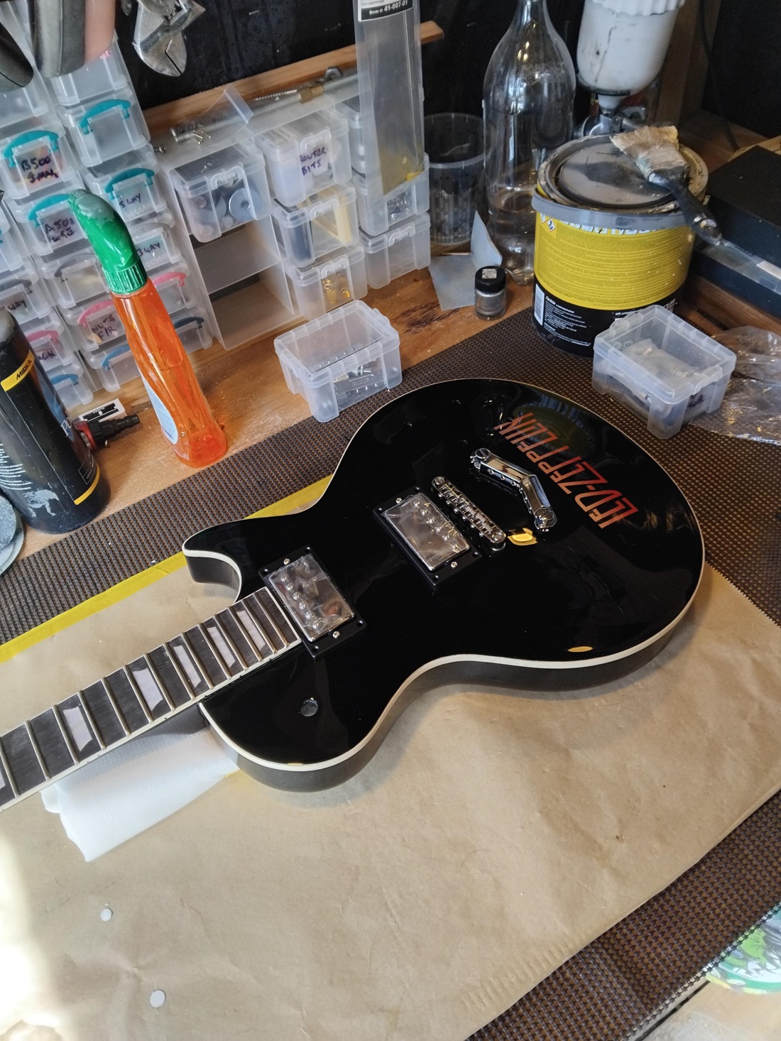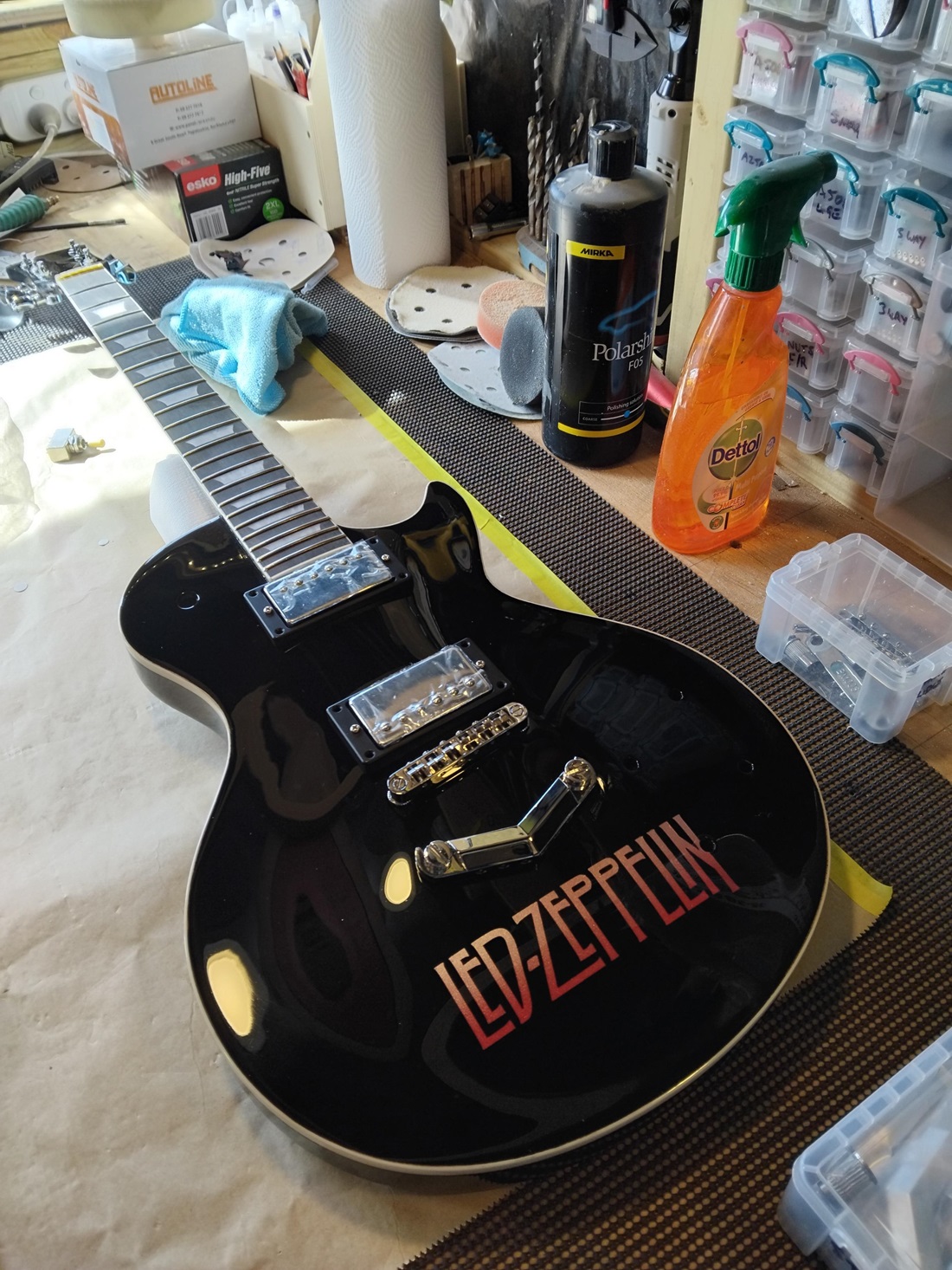 All the fret work sorted and polished (plus a repaint of the back of the neck thanks to the masking tape protecting the fretboard pulling a strip of clear off the back....!!)