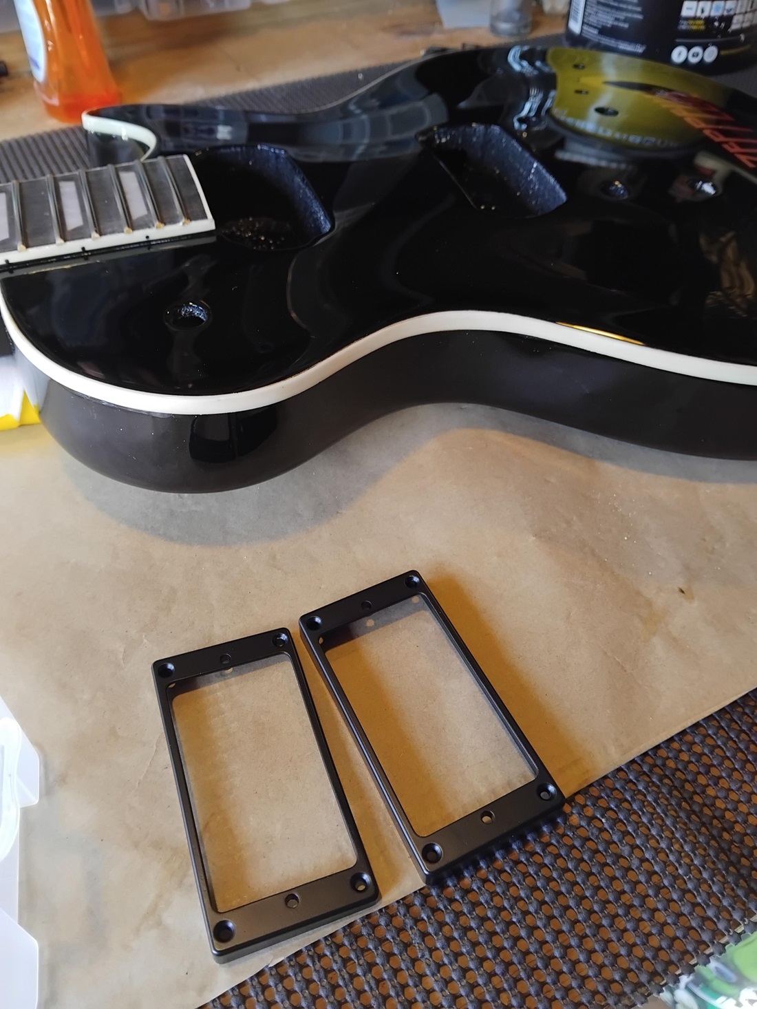 I ended up replacing the cavity covers as you can see... the originals were a cream colour, so that was never going to work! I had planned on using some brushed alloy I have floating around, but it wasn't wide enough to cover the bigger cavity. I have plenty of red perspex, and it dawned on my that it was probably the best choice given the rest of the colours on the guitar. So, out with the scroll saw to make them and then the sandpaper to make them fit in the cavity recesses.