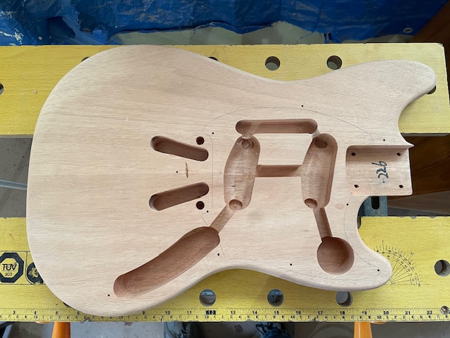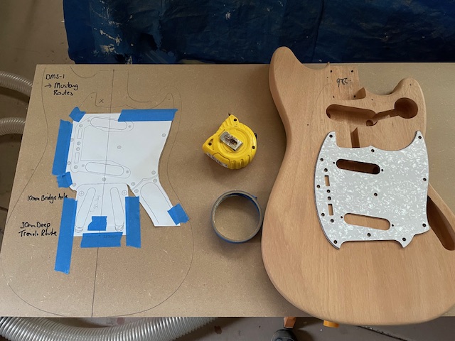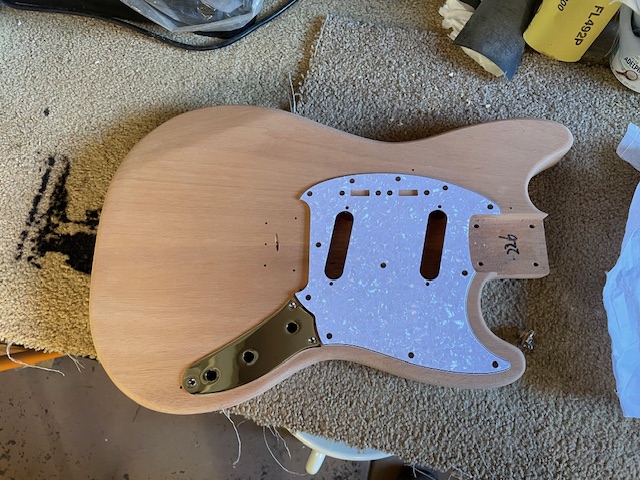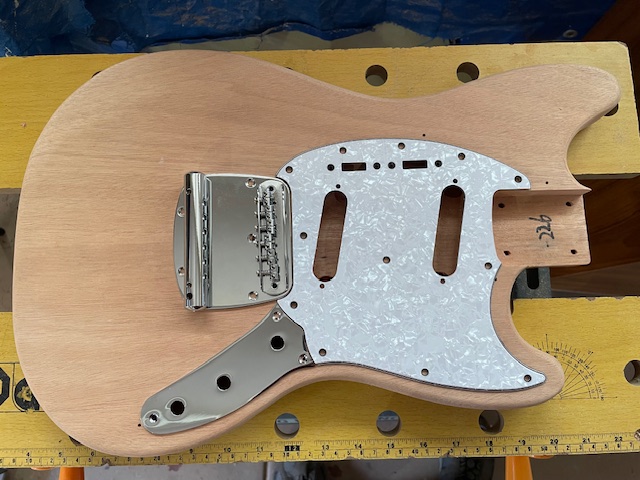 I have purchased a mustang style trem, a pick guard for 2 slanted single coil pups and 2 switches, a metal control plate. I will need to do a bit of routing to fit the trem and switches. I will also need to add some wood around the control plate area to take the screws, and hide the join between the guard and the plate.