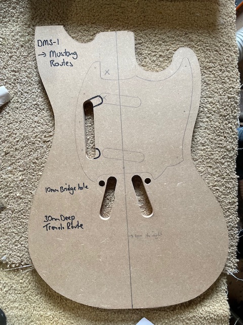 Today I have managed to download a template for the mustang tremolo route and for the switches. Then transferred this to a 12mm MDF sheet. I then drilled out the ends of the tracks and jigsawed out the main shape. Tidied them up which a small drum sander.