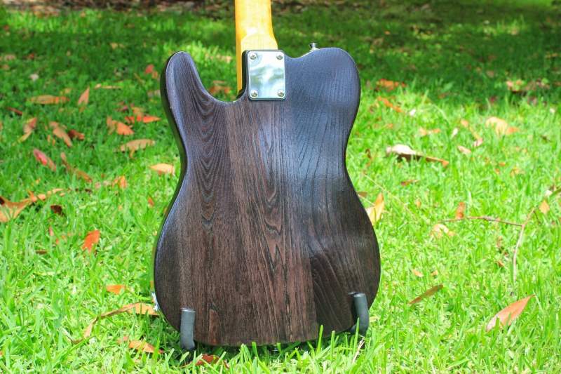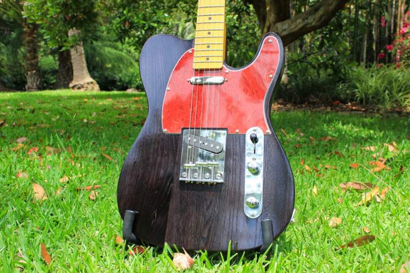 Ok, time to ruin the all Gibbo show. Here's my Ash Telecaster 'The Shoegazer'. It's finished in black Colortone and Tru-Oil. The grain has intentionally not been filled to allow the texture to be visible. The pickguard is red tortoiseshell. The pickups are Tonerider, the cap is Orange Sprague and the pots are Bournes. The nut is a bone job filed by yours truly.
