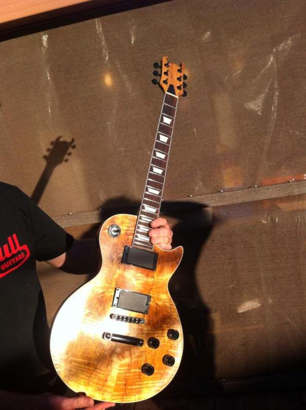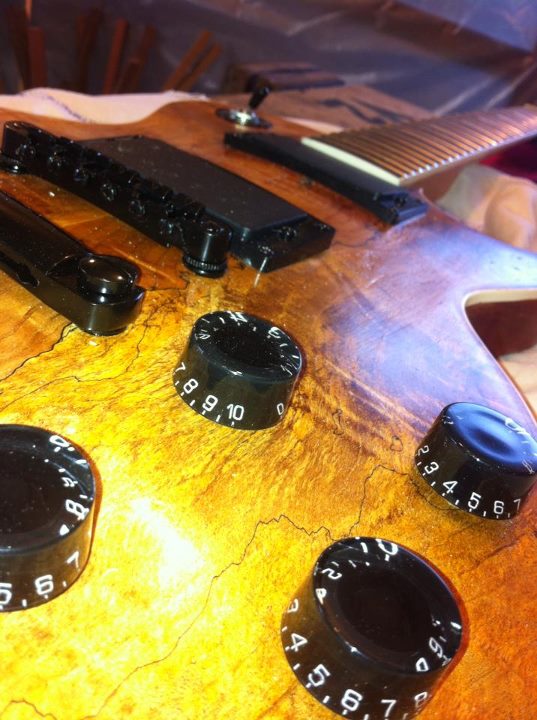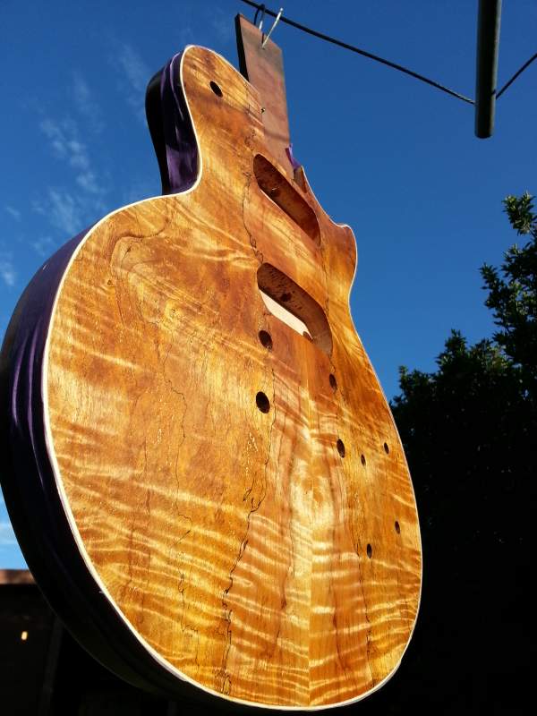 I built a LP-1S almost 2 years ago (was my 1st GOTM) and finished the cap in wudtone burning sun (orange) and back sides were hot auburn. Dingotone outback sunset (orange) would look excellent on the spalted cap. Here's couple of pics to show you what mine looked like, especially how it glows in the sun