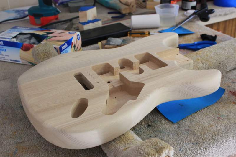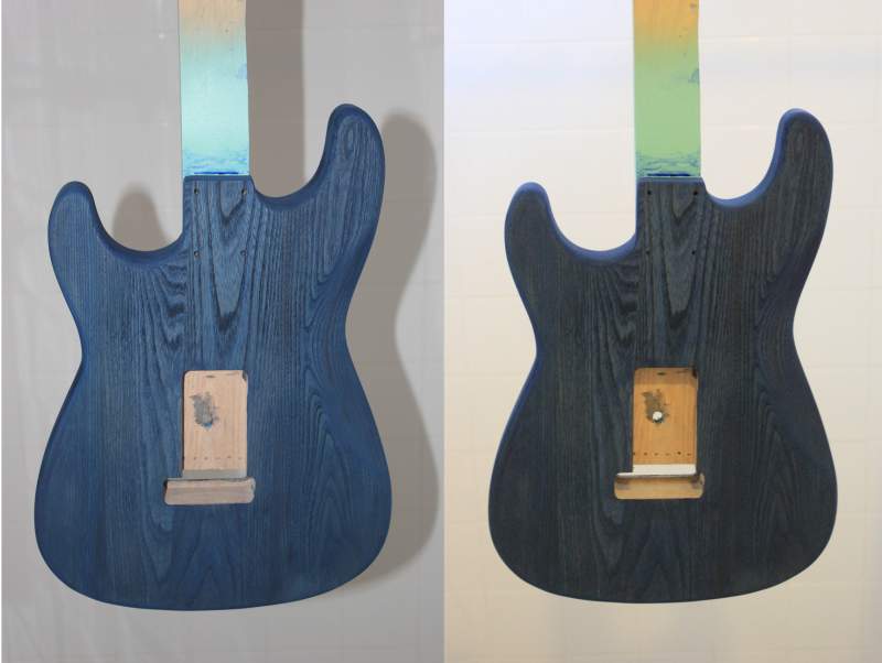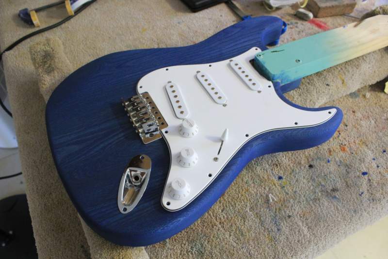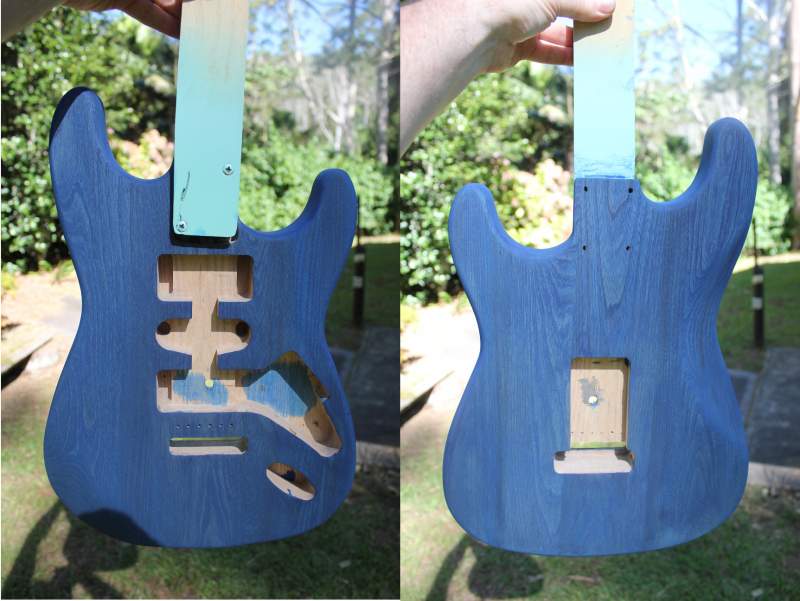 Once I was happy with the amount of black left in the body (still a little more than I was hoping for) it was time to start the staining. After agonising for a month over what dye to use, I finally decided on the Colortone blue. It's not as "brilliant" a blue as I would have liked, but with the darkness of this piece of ash combined with the ebony Timbermate, she's never going to be a deep "brilliant" blue anyway.