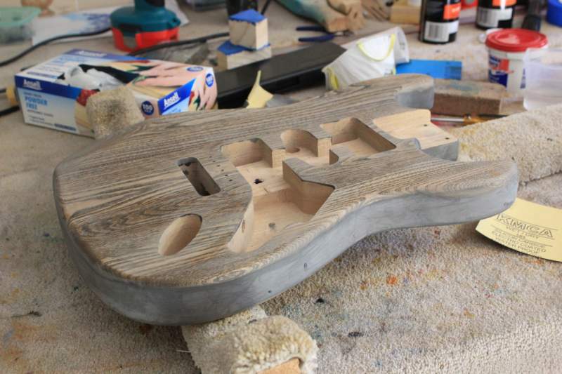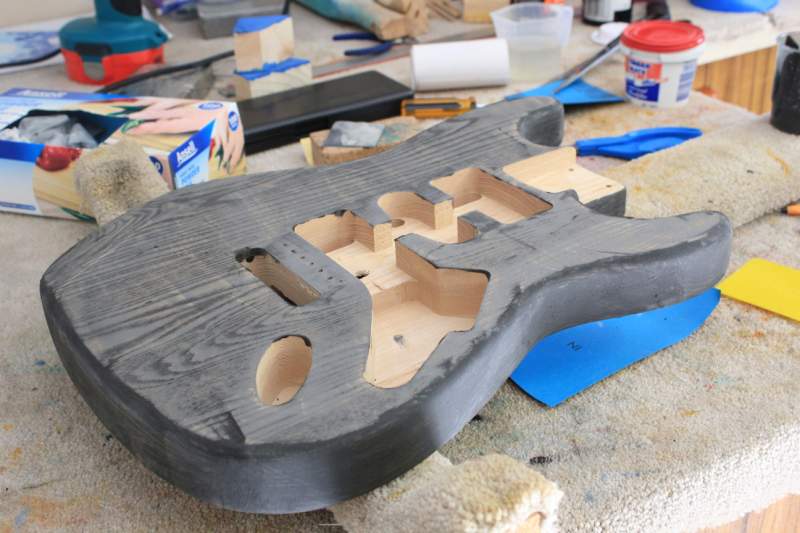 Then it was time to fill the grain. Instead of dying black and sanding back, I opted to fill the grain with dark filler in much the same way as I did with the Ash LP. For that build I used walnut Timbermate as it matched the brown hues in the burst very nicely. For this build I decided to use ebony Timbermate as the black would work much better with a blue dye. I actually did a few tests with 4 different Timbermate colours and the ebony was certainly streaks ahead of the others. Anyway, I got the Timbermate on and a few hours later sanded it off.
