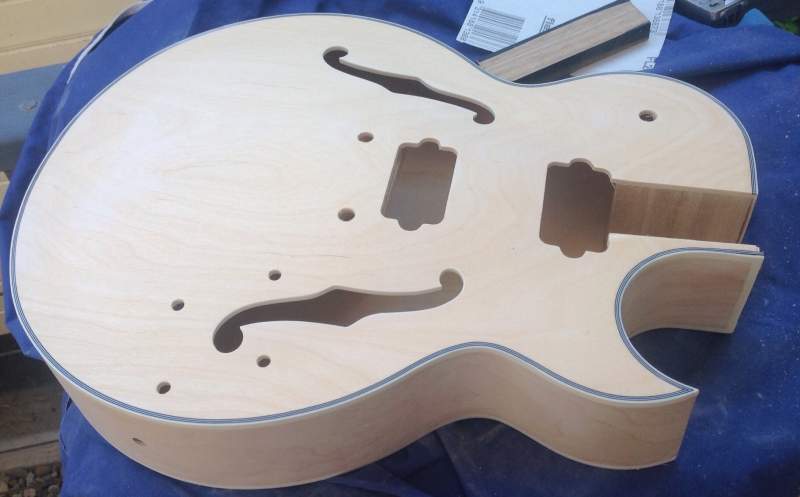 Well, I had pretty well resolved not to build anymore guitars and stick to valve amps but, after seeing the ES-3 on such an amazing Sunday Special price a few months ago, I couldn't help myself. In fact, it was my wife who said 'that's cheap, you should get it'. And being a devoted husband, I did as I was told. Anyway, the humidity has finally settled in Mackay so now it's time to build. At first look all seemed sweet apart from a couple of small depressed lines across the fretboard, and a neck heel that didn't quite fit squarely into the cavity. So, after some gentle sanding (with 180 grit and a rasp!), that problem seems to be OK now. I also did some wet ragging and found that there were no glue issues around the binding - excellent. I've given the whole thing a quick 400 sanding and already I'm impressed. Roll on next weekend.