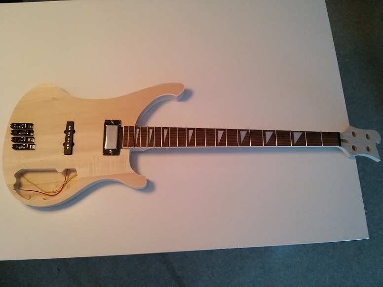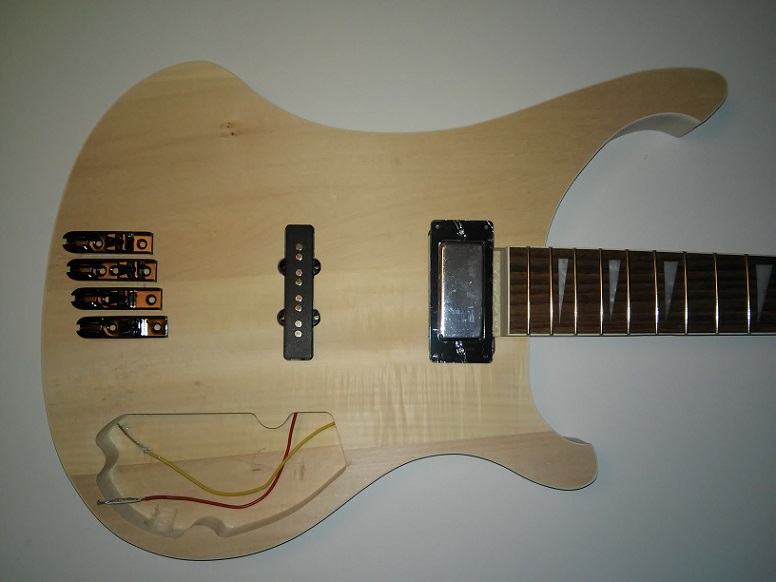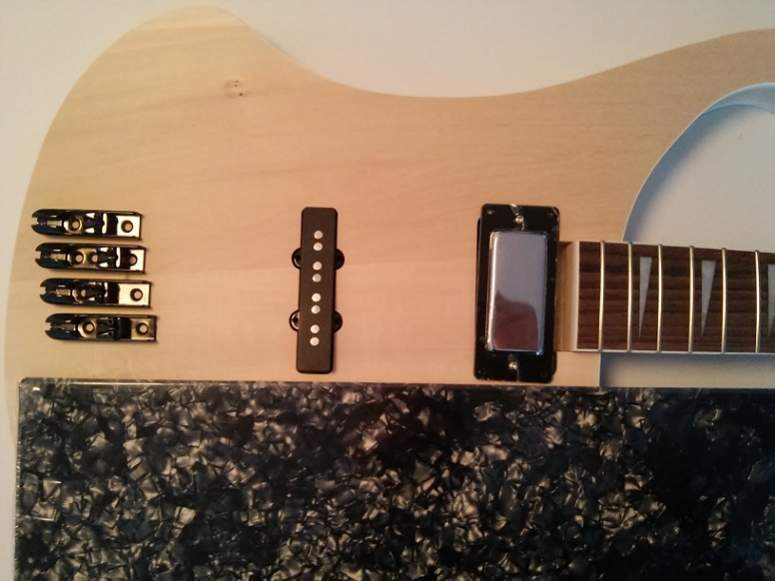 Also I took out the pickguard material I ordered for the other bass I have built but then decided not to use it. I think it would look good on this one. The shades of black on the pickguard are quite similar of what I had in mind for the grains on this body and neck. AT least thatīs what Iīm trying to achieve. And with high gloss TO surface the pearl would look nice. Same material I was going to use to make a ring for the J pickup - shape it a bit to go nicely with the pickguard. Might be too much to try blending both pickups with in one pickguard? covers too much of the body surface in my opinion.