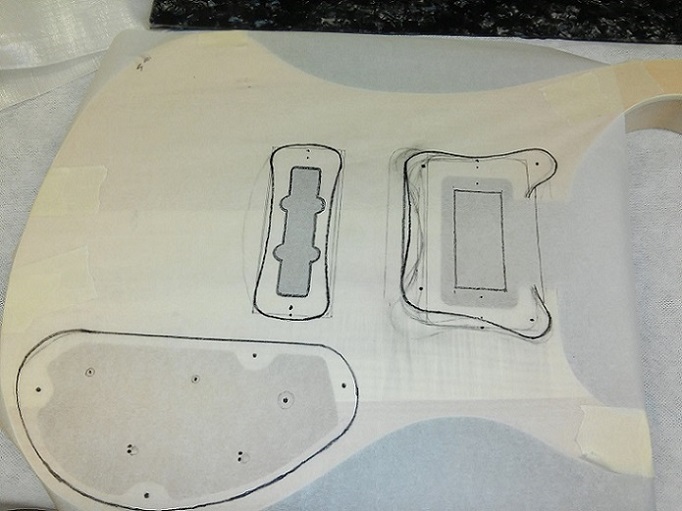 Then I decided to try making the templates for the custom pickguard. Had an idea one night to use transparent paper for it and this is how it looked. The straight translation from finnish is "butter paper" - donīt know what it is in english but the paper is used when cooking in the oven. Takes pencil and permanent marker well. Threw some ideas in the air and these are not likely the ones Iīm eventually gonna use, but if I wanted to show the flaming on the body I need to downsize the pickguard/scratchplate. Thought that it could be useful to someone planning the plates to try this method. Please feel free to throw ideas my way and comment.