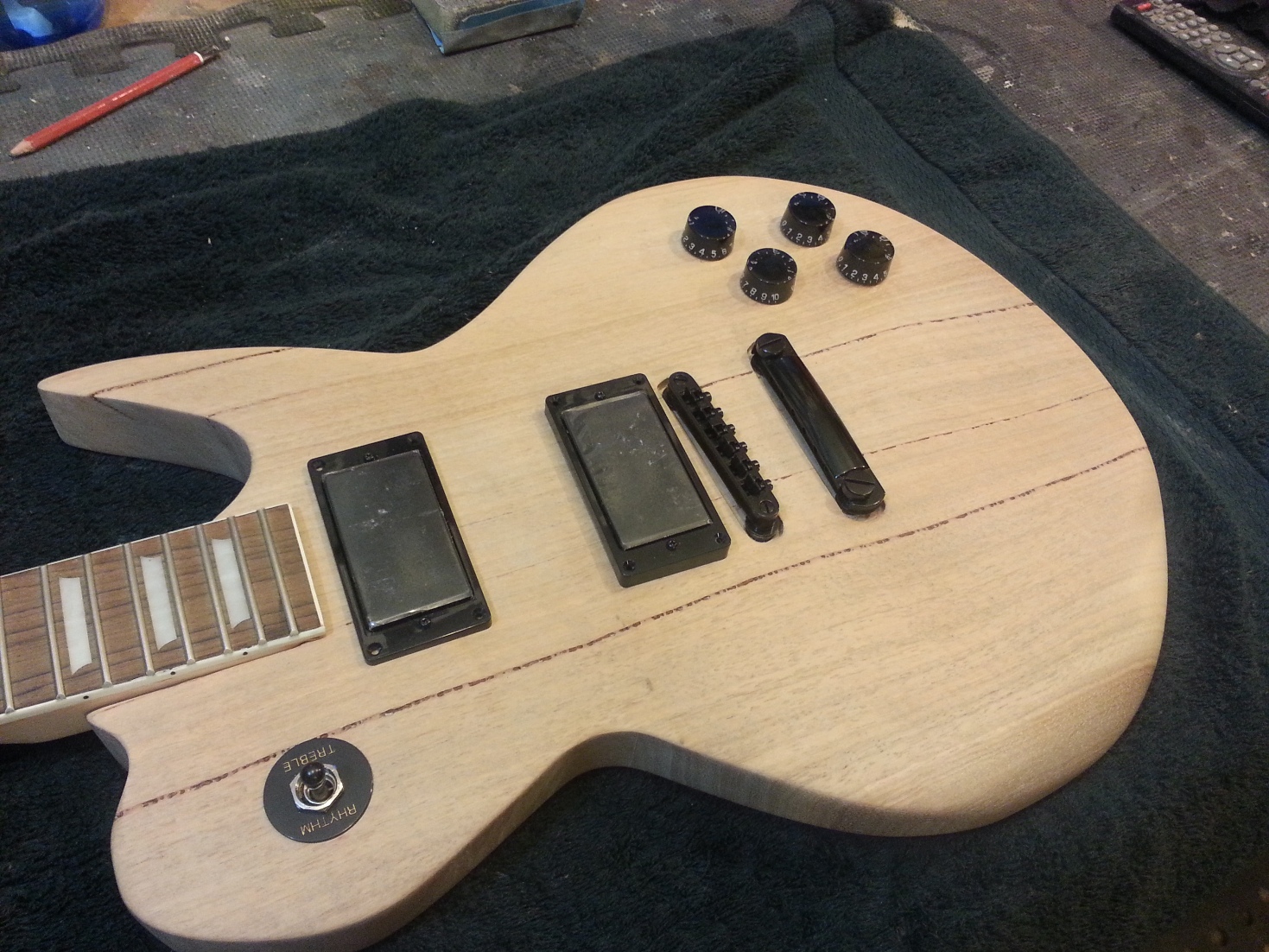 more pics. I just ordered some goodies for the build from Realtone. A black toggle switch, black Gotoh tuners, zebra rock song pups, push pull pots, black neck screws and bushings and the treble bleed cap to try out.