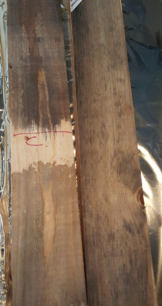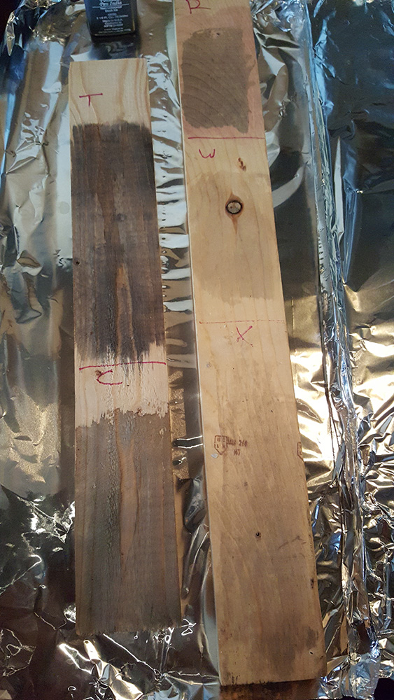 If you're interested... This is from a test (just on some scrap pine) just to see how different tannin bases affect the process. In the picture : tea (T), coffee (C), Red wine (R), white wine (w), and no base (X). (The "no base" section has some weird shading in it because it wasn't doing much, so I tested to see what would happen if I put tea on *after* the vinegar. A little change, but not much. ) Then the vinegar solution went on... it was pretty cool to watch. The second picture shows the tea and coffee bases next to a board that I just washed with india ink/water. In that photo, the tea base looks pretty splotchy because I wiped it in the center with some water to see if I could stop the process or if it would just keep going. It did stop. There is also a streak in it because I put a brush of the vinegar solution to see if it would kick back in. It did.