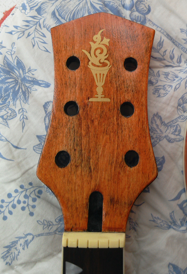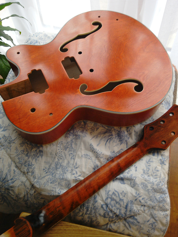 I sanded the neck down again and then stained with orange. Then came the Tung Oil, eight coats. But I didn't like the sheen it gave so I switched to Tru Oil which gave a better shine. And the effect on the neck was just what I was looking for. Click image for larger version.
