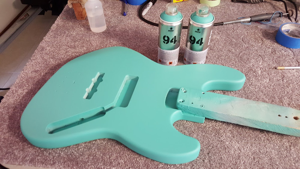 It's been a while since I updated this thread, and a lot has happened in the meantime. For starters, everything was going well on the body until, in my haste, I picked up a can of primer instead of clear acrylic off the bench. The resulting white slash across the body bid a quick farewell to the trans black finish and hello to a solid colour - seafoam (one of my faves).