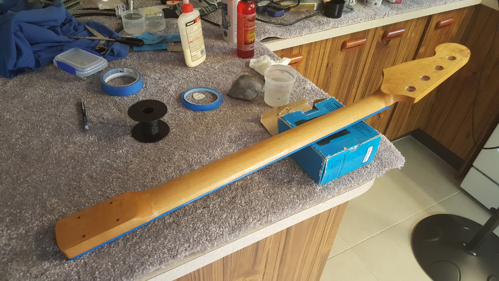 I've basically finished the clear coats and she's been hanging for a few months in the man cave curing. This is probably the first build of mine to receive a full curing period! While it cures (and cures and cures) I've shaped the headstock using a standard Fender template and got some Colortone Vintage Amber dye on the neck. Tru-Oil is the name of the game now, and I am currently 4 coats in. Lots more coats, with wet sanding in between, to follow.