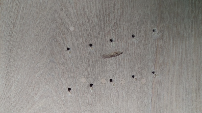 I filled the old holes with wooden skewers sticks and sanded them flat. They won't be visible anyway, so not too stressed about these...