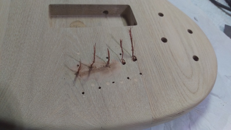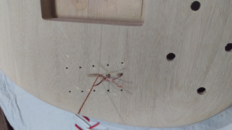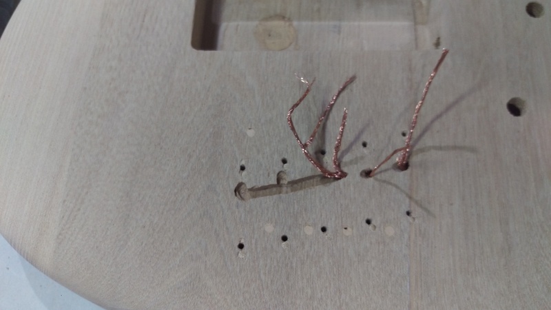 For the 2 x higher strings, I managed to drill straight down and find the hole that was pre-drilled in the factory, that goes from the middle bridge to the control cavity.